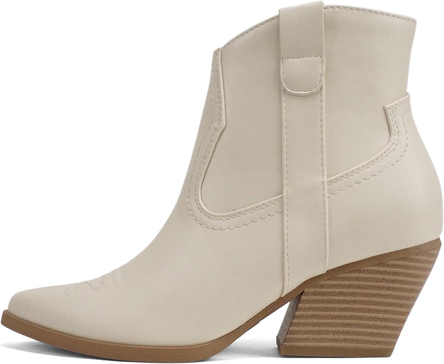 Soda “ABEAM” ~ Women Pointed Toe Medium Heel Ankle Shaft Western Boot Bootie with Side Zipper(Off White Pu)