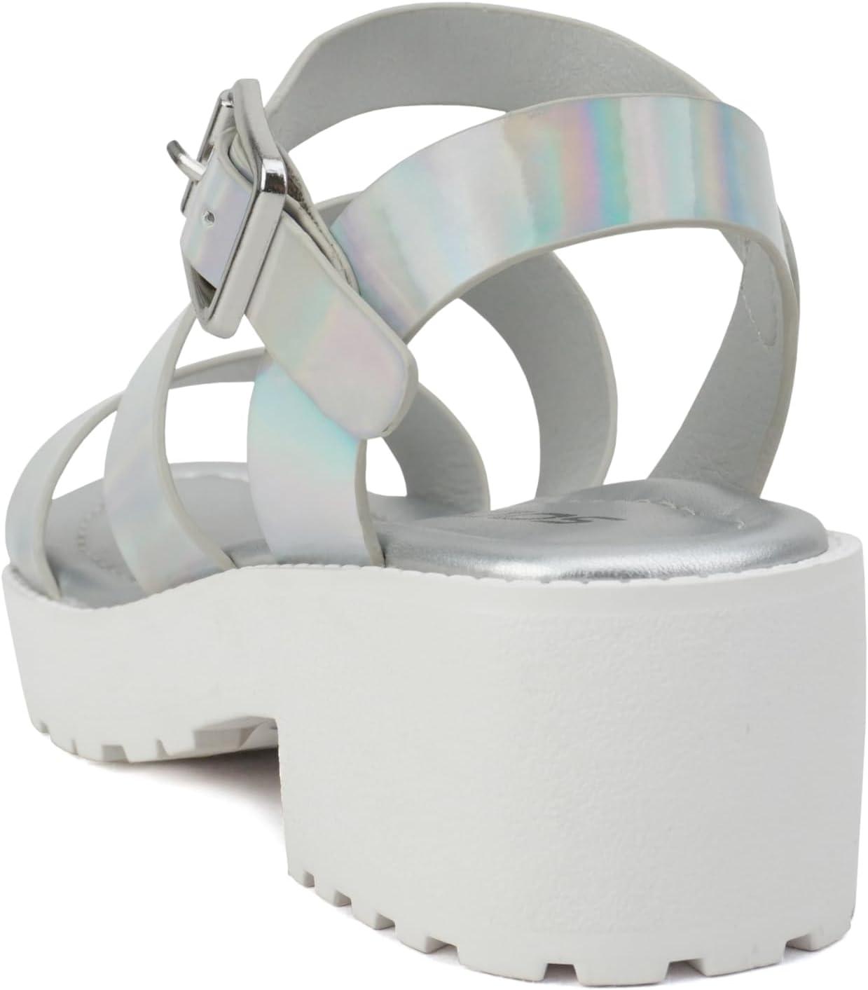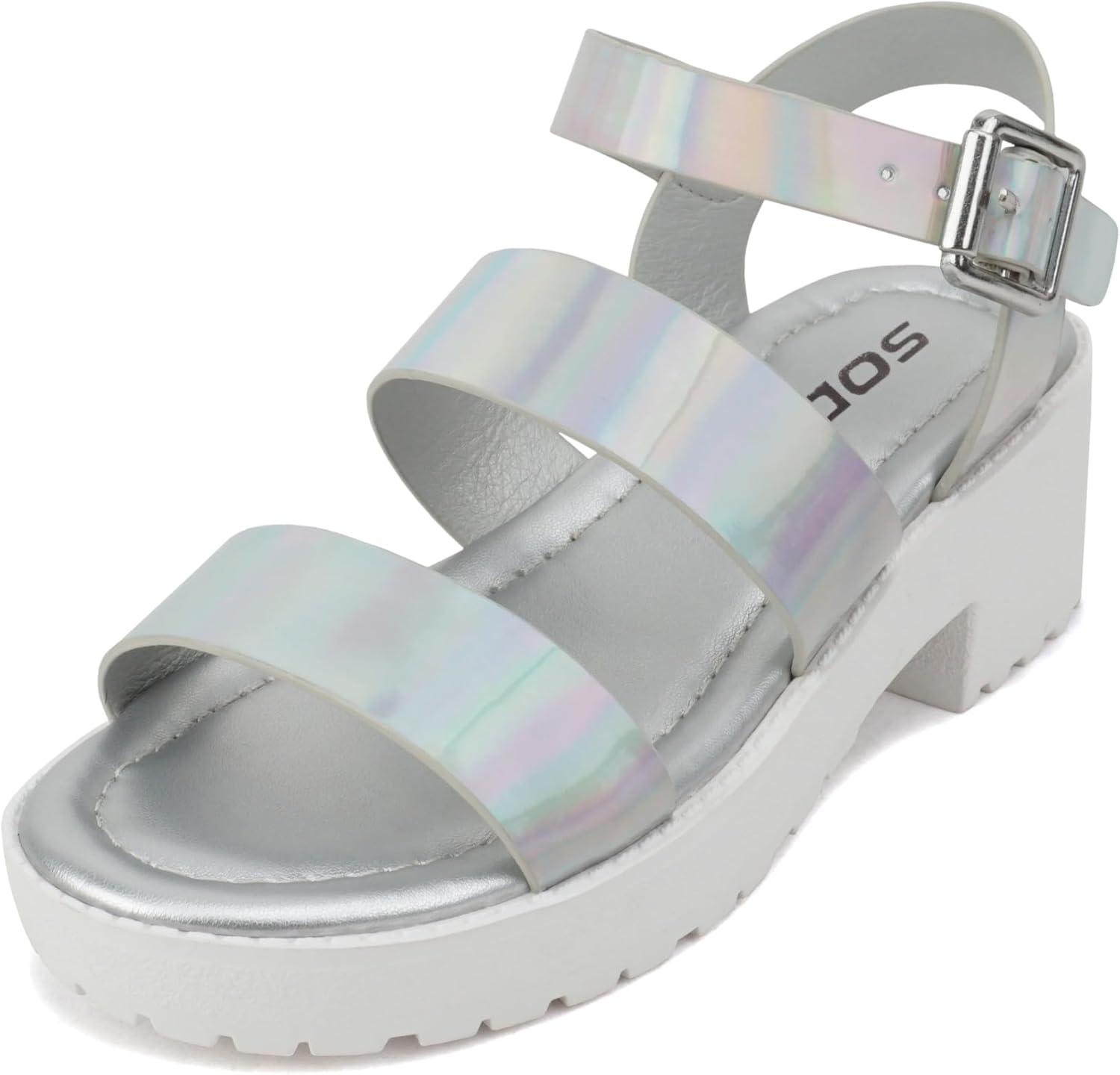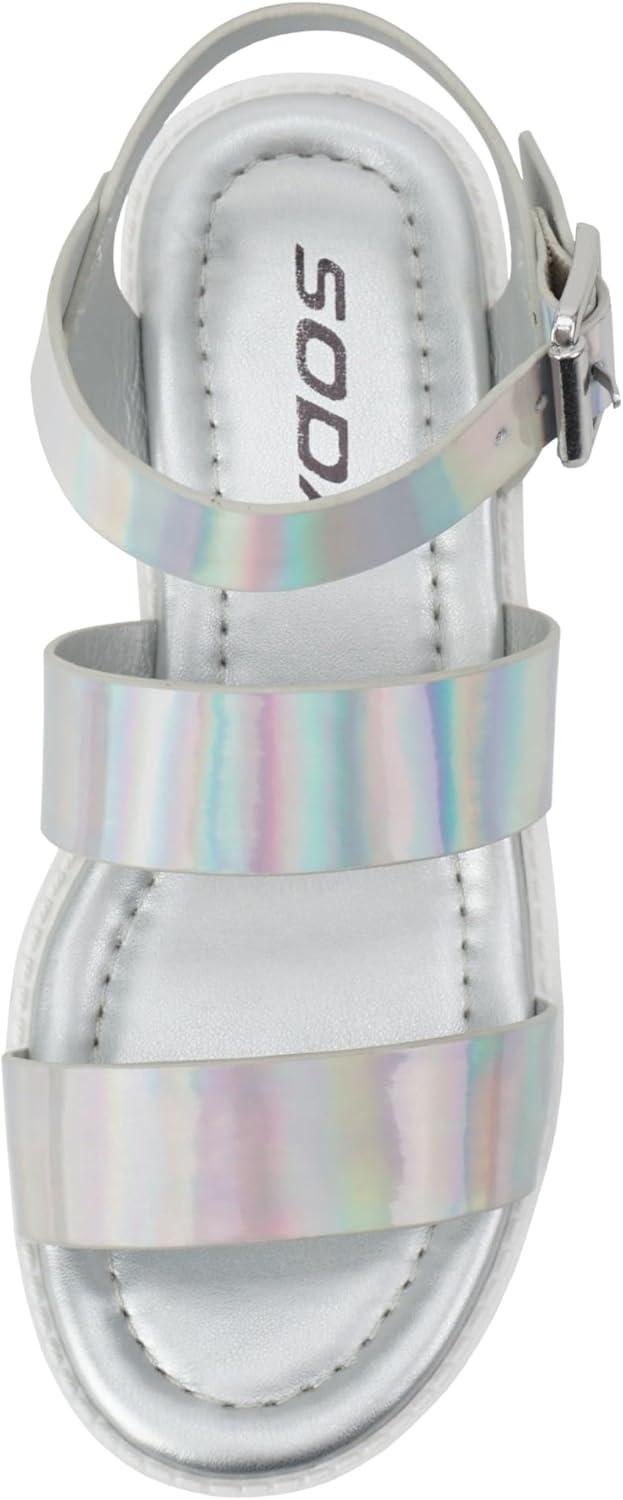 Soda ACCOUNT-2 ~ Little Kids/Children/Girls Open Toe Two Bands Lug sole Fashion Block Heel Sandals with Adjustable Ankle Strap(Silver Iridescent Pu)