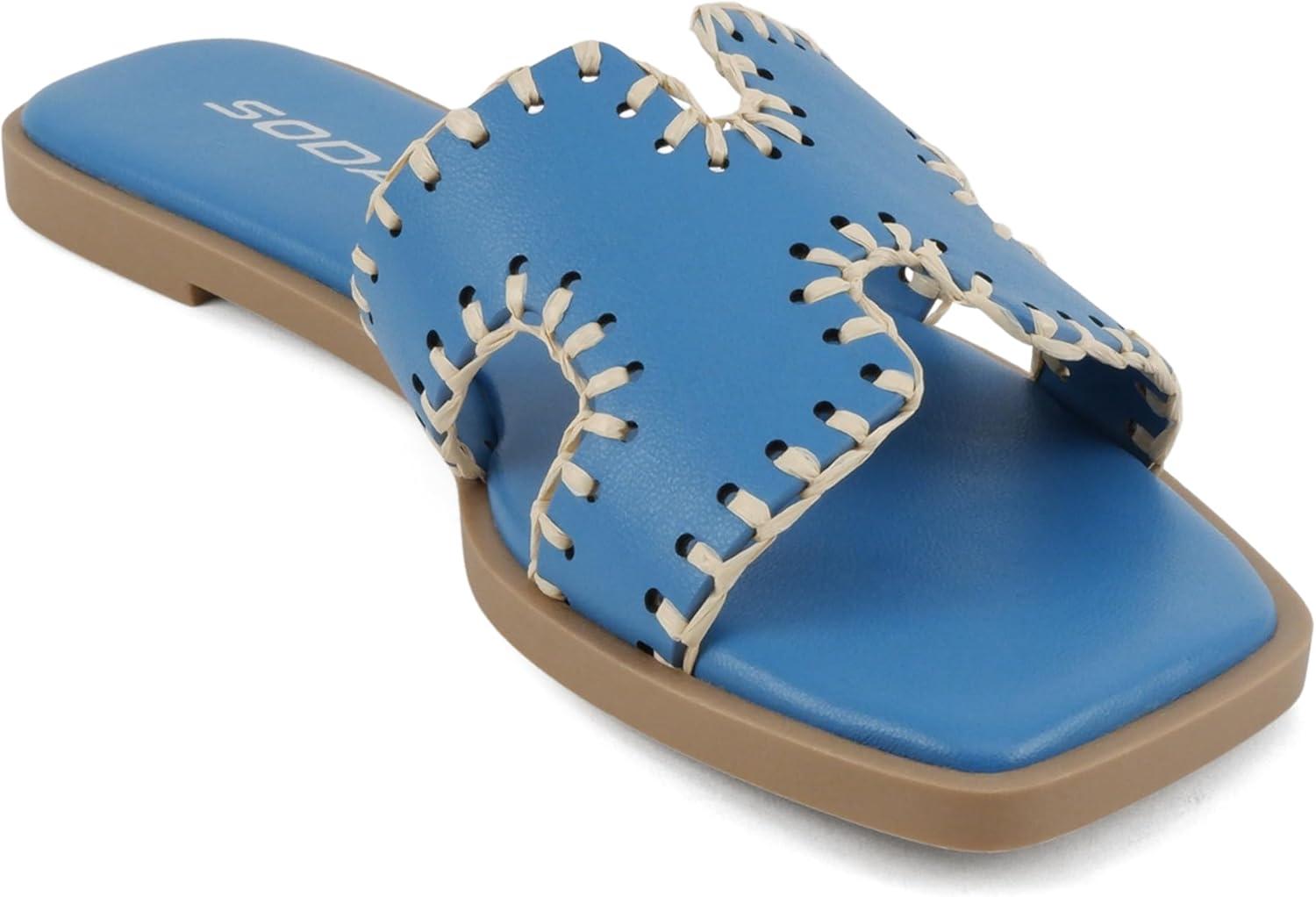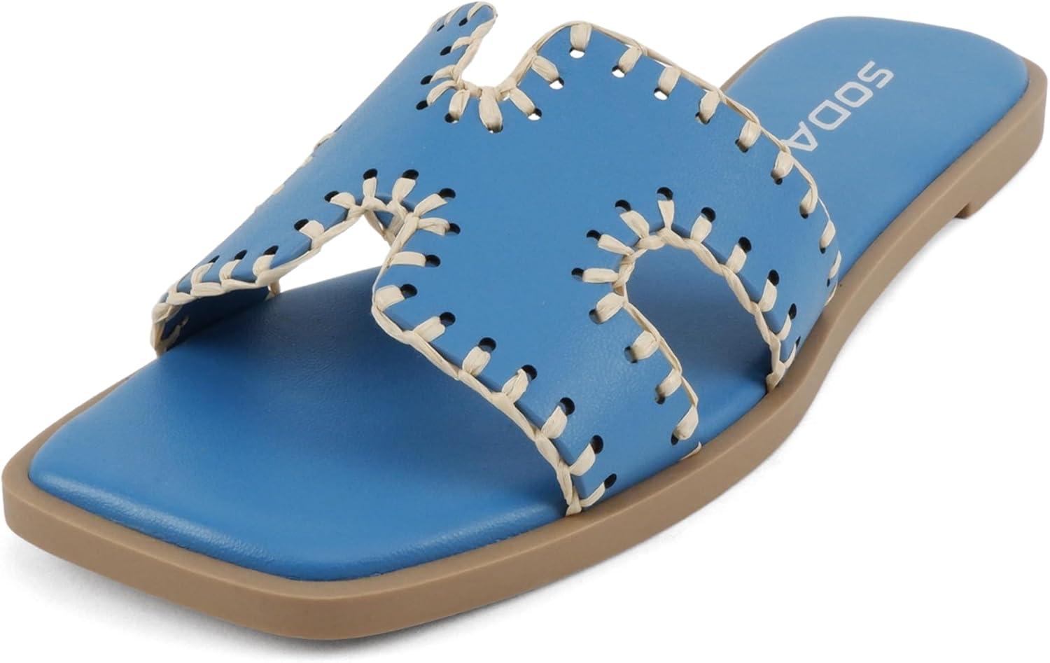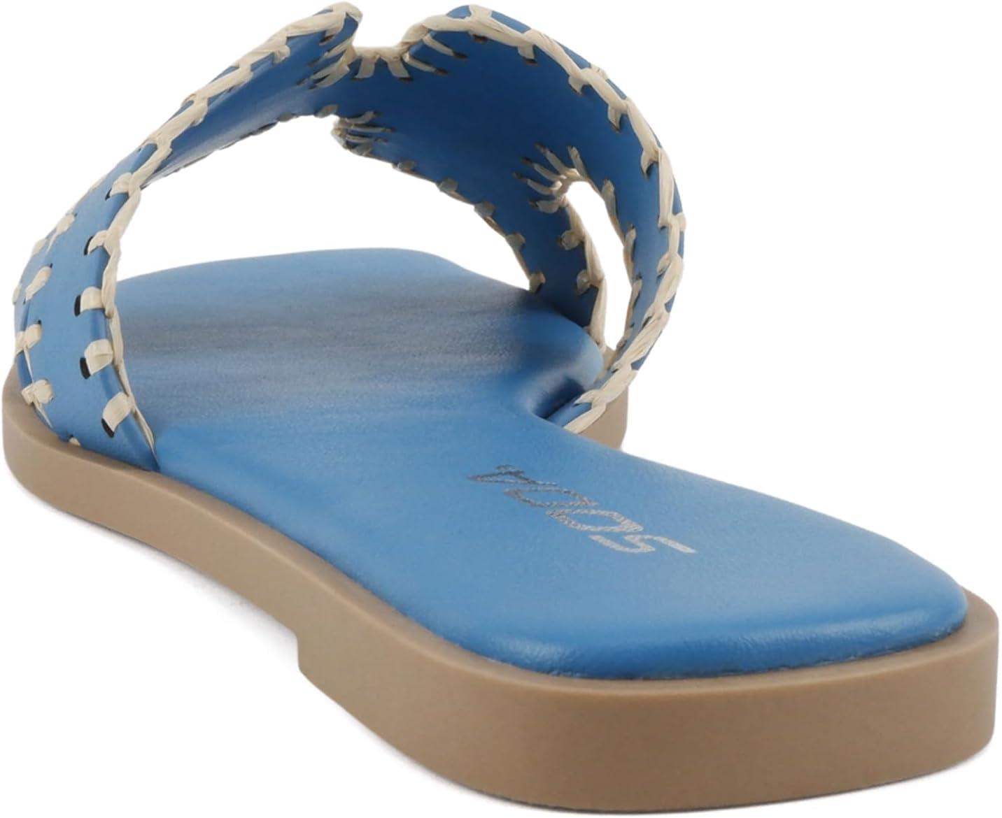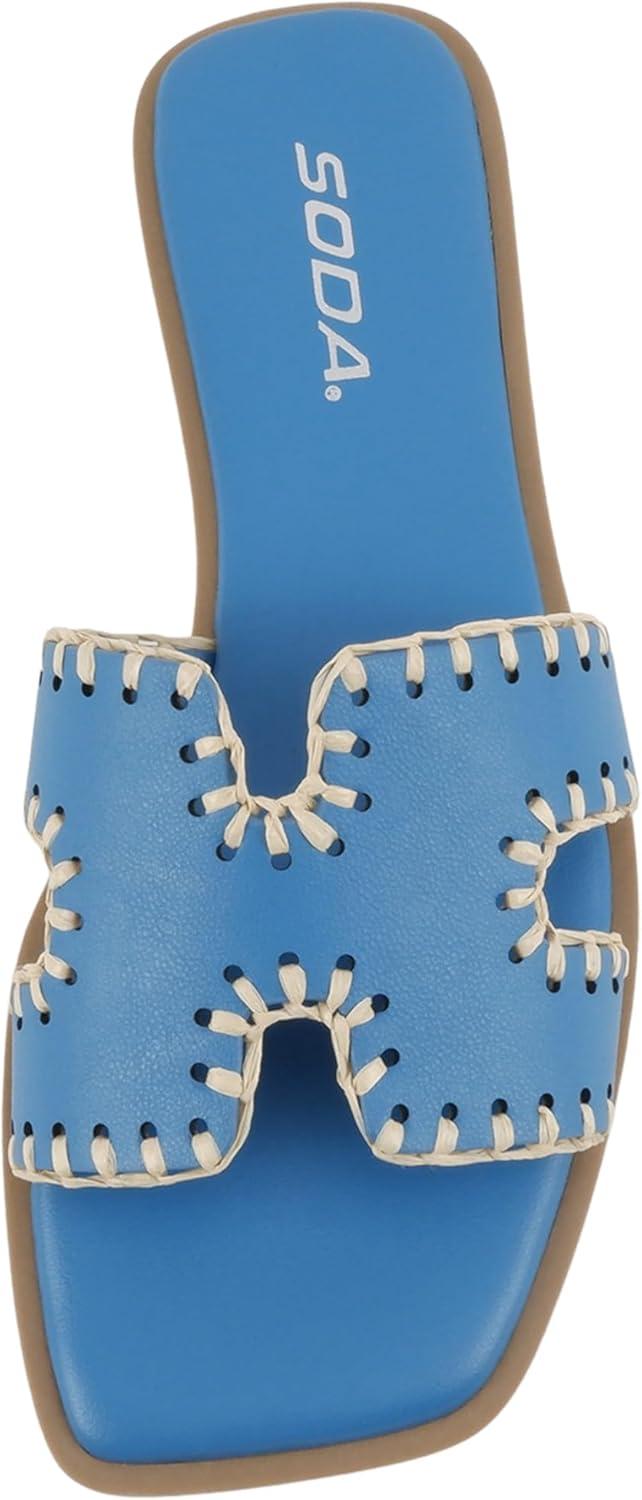 Soda Finity ~ Women Square Toe H-Band Slide Sandals with Raffia Details(Blue Pu)