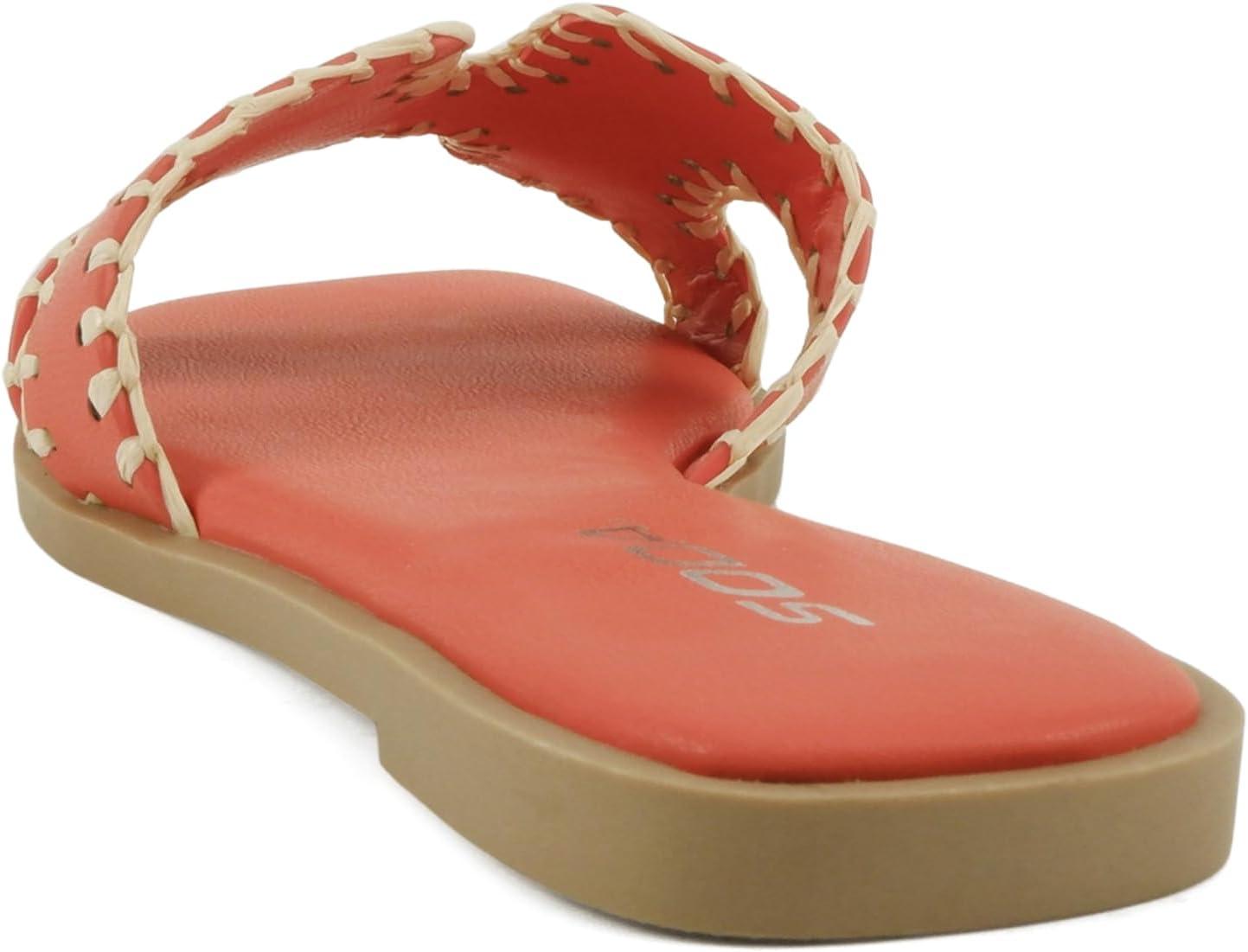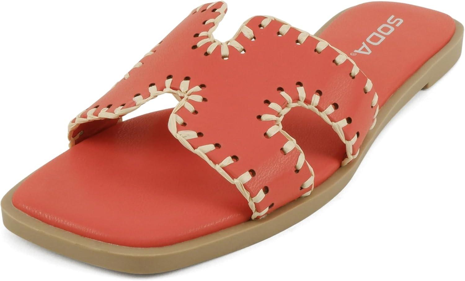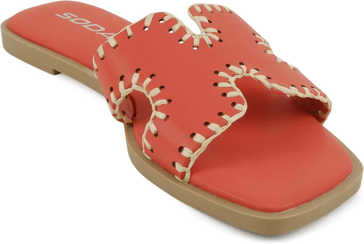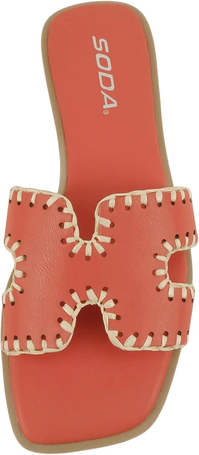 Soda Finity ~ Women Square Toe H-Band Slide Sandals with Raffia Details(Bright Orange Pu)