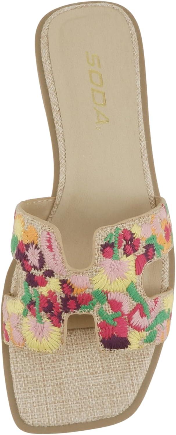 Soda Gymnic ~ Women Square Toe Embroidered H-Band Flat Slide Sandals(Raffia)