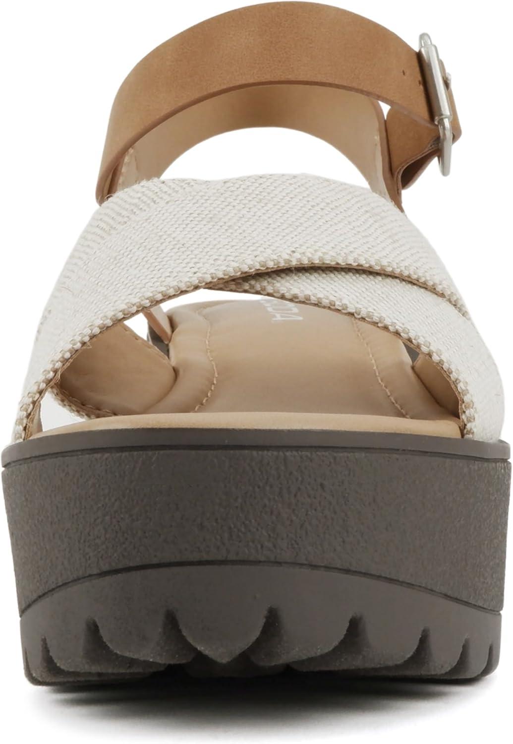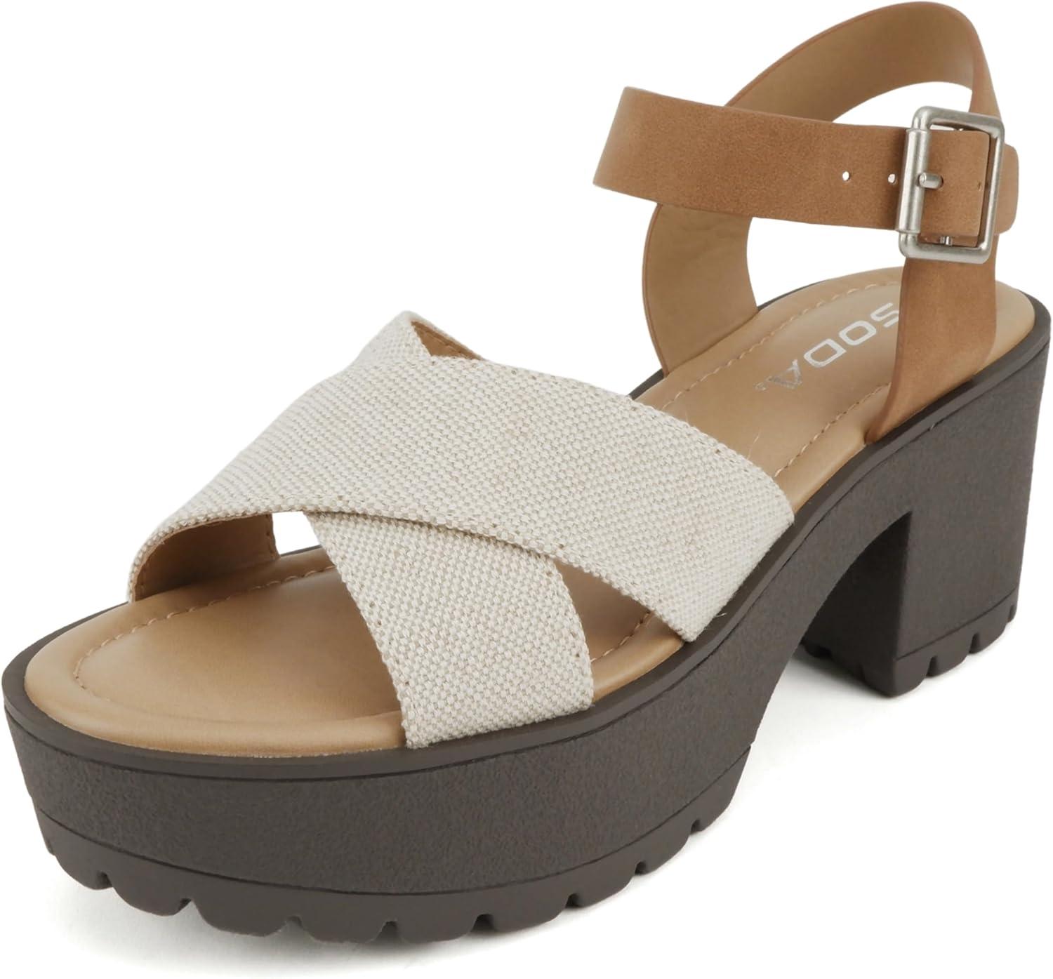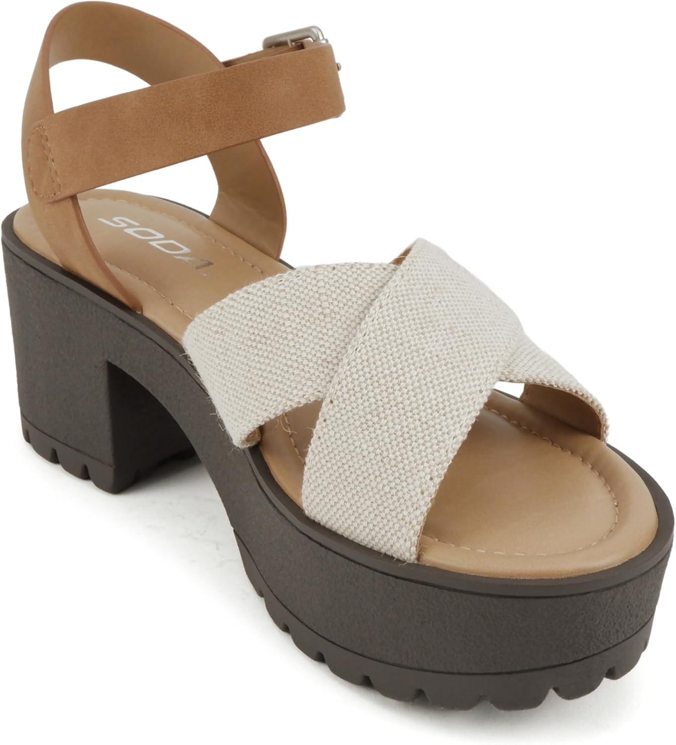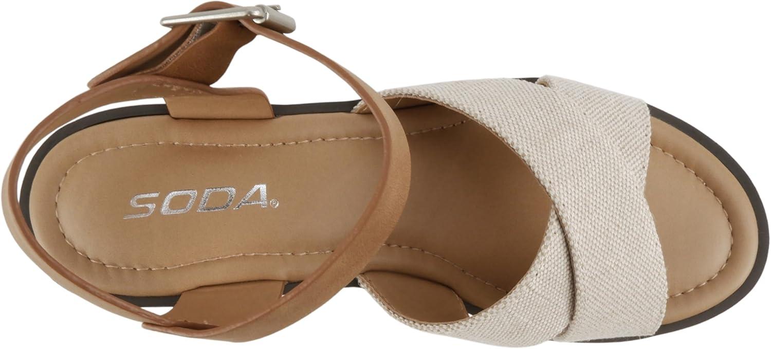 Soda “Joey” ~ Women Open Toe Criss Cross Strap Mid Heel Sandal with Adjustable Ankle Strap(Beige Canvas/Tan)