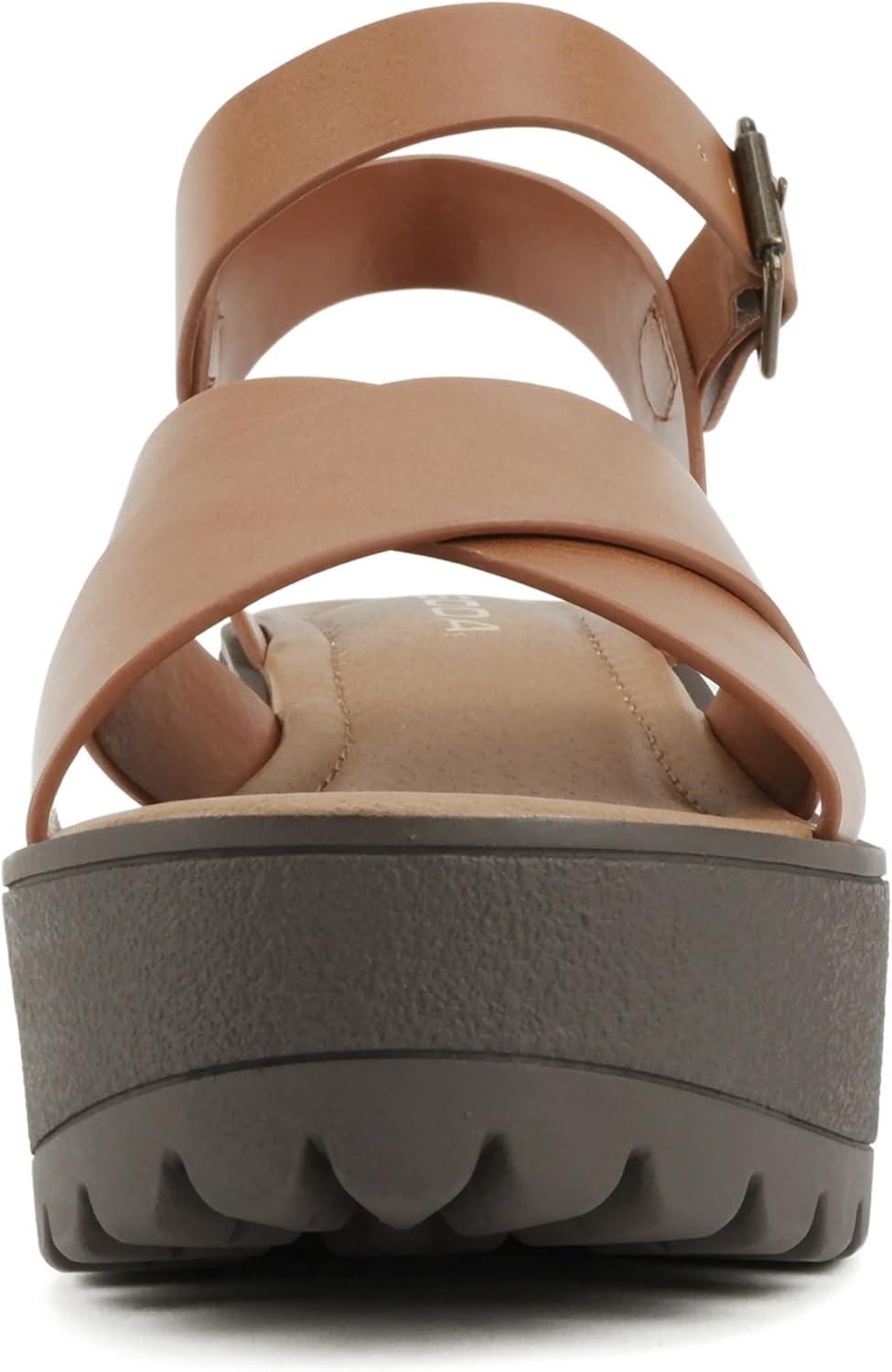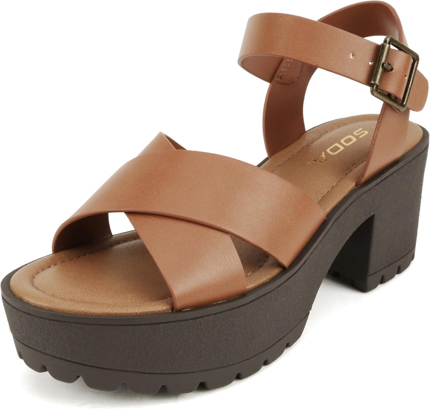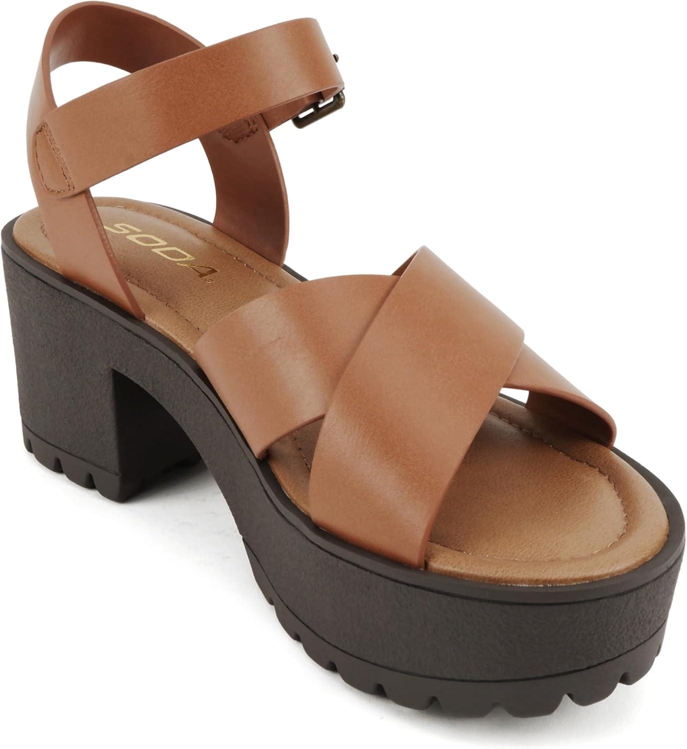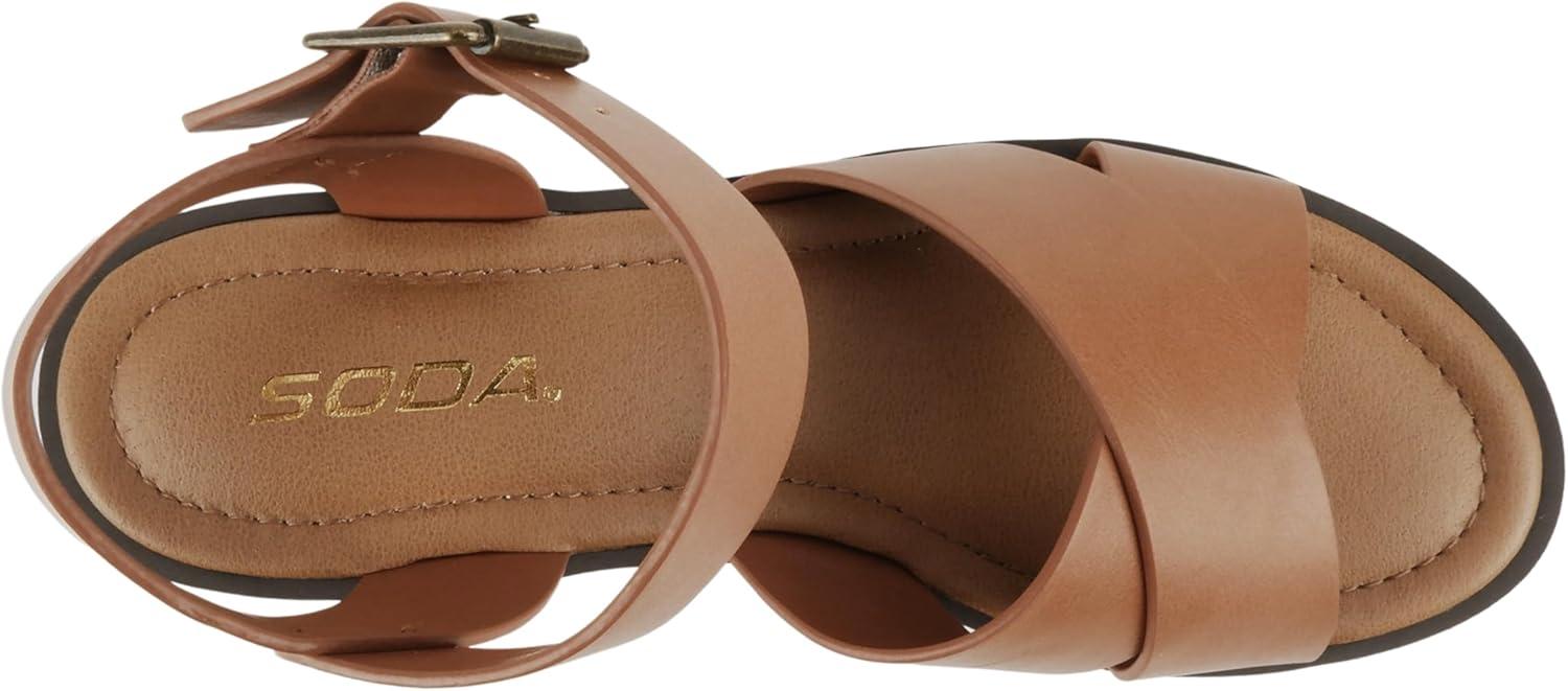 Soda “Joey” ~ Women Open Toe Criss Cross Strap Mid Heel Sandal with Adjustable Ankle Strap(Tan Pu)