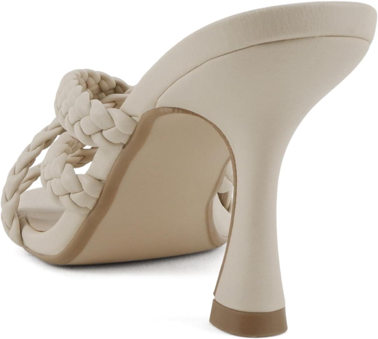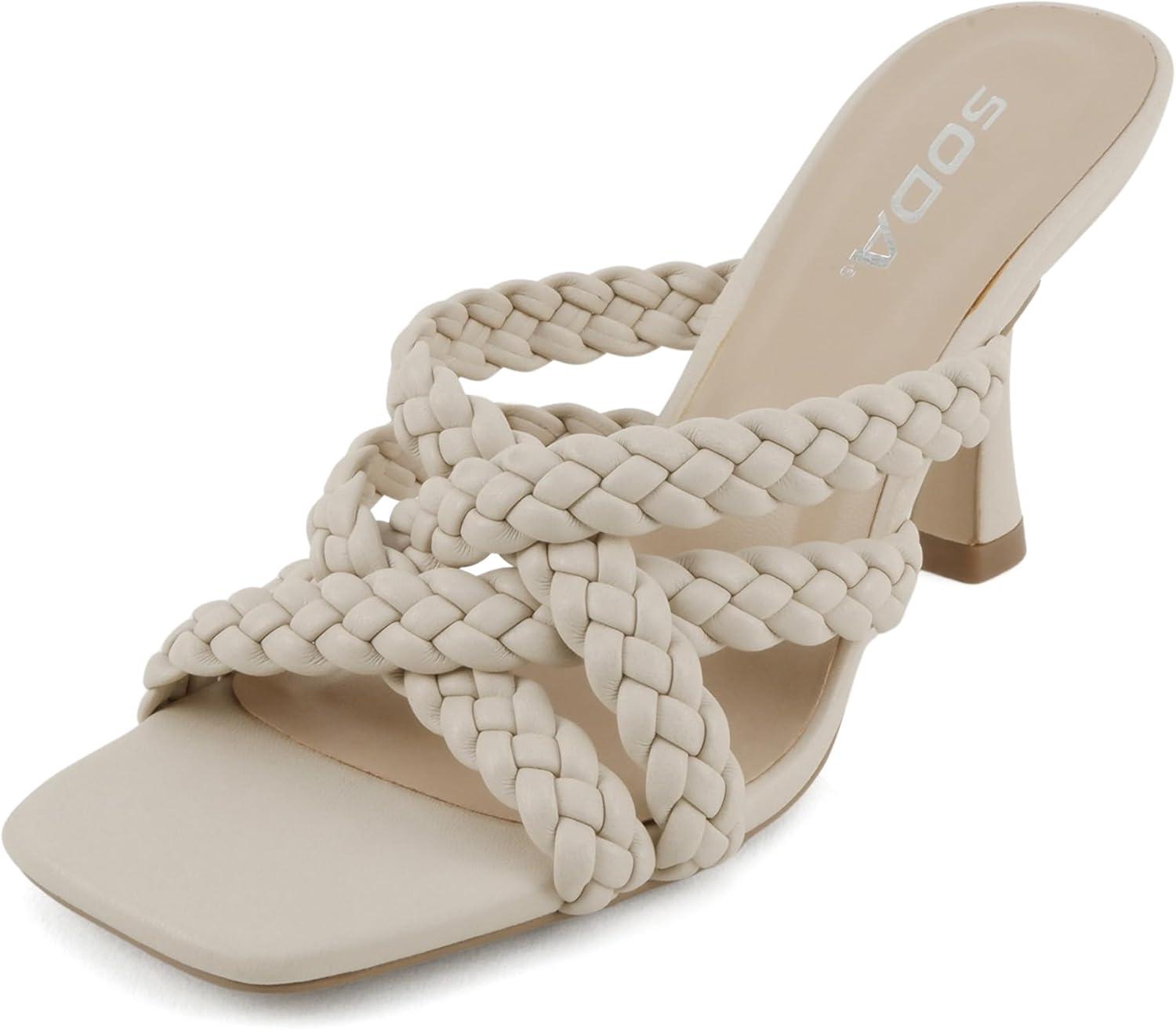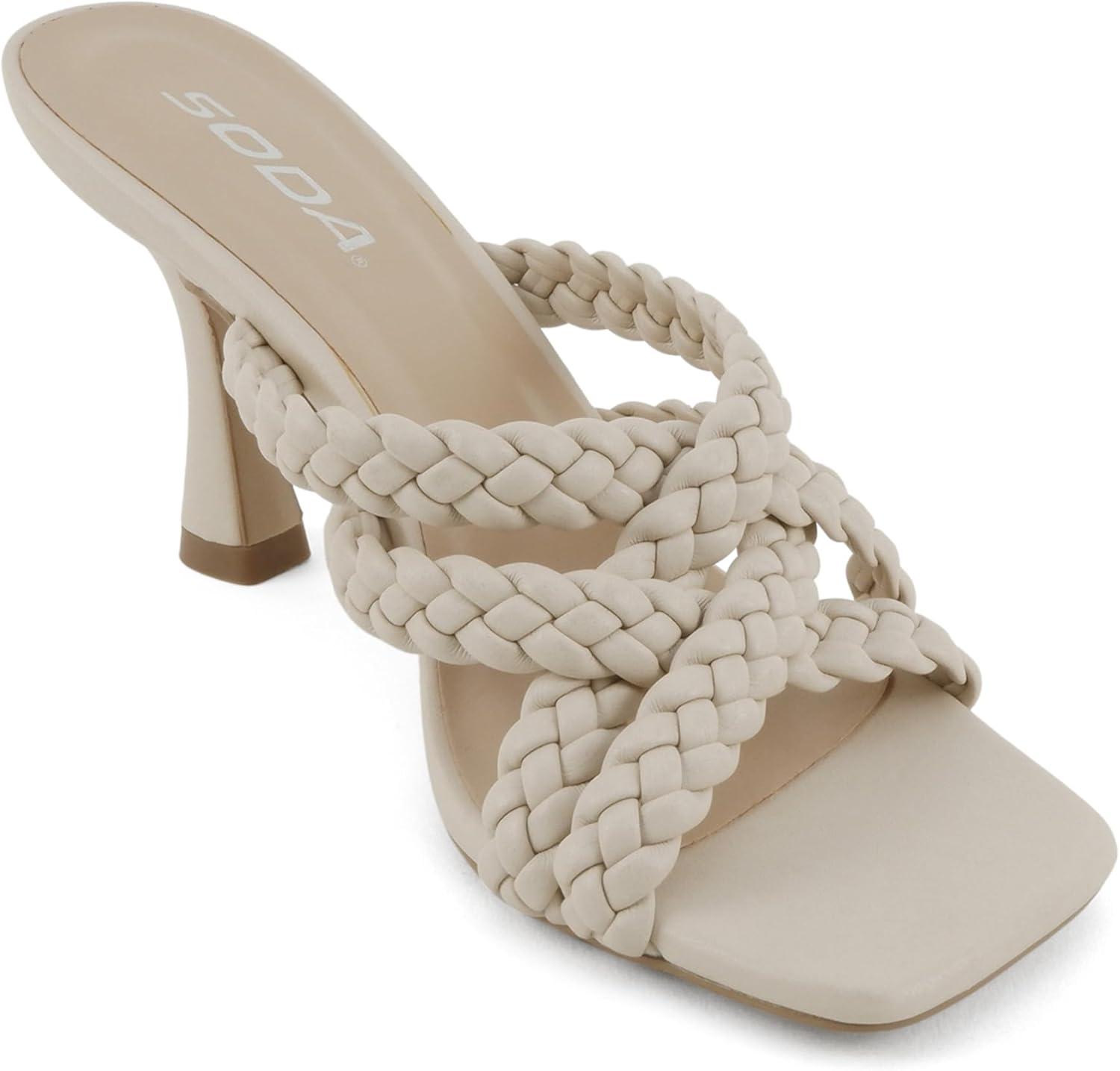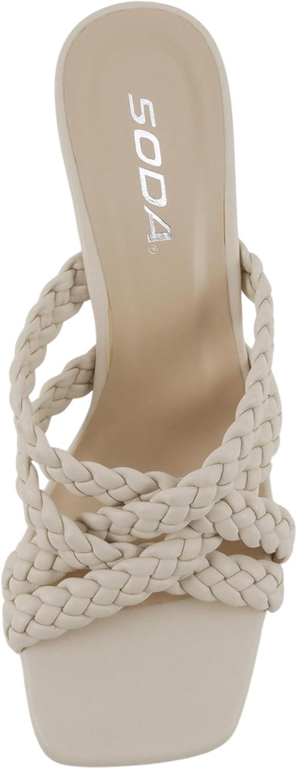 Soda “Kellan” ~ Women Square Toe Braided Multi-Strap High Kitten Heeled Sandals(Bone Pu)