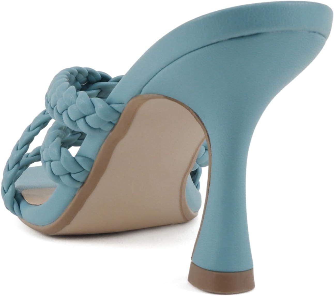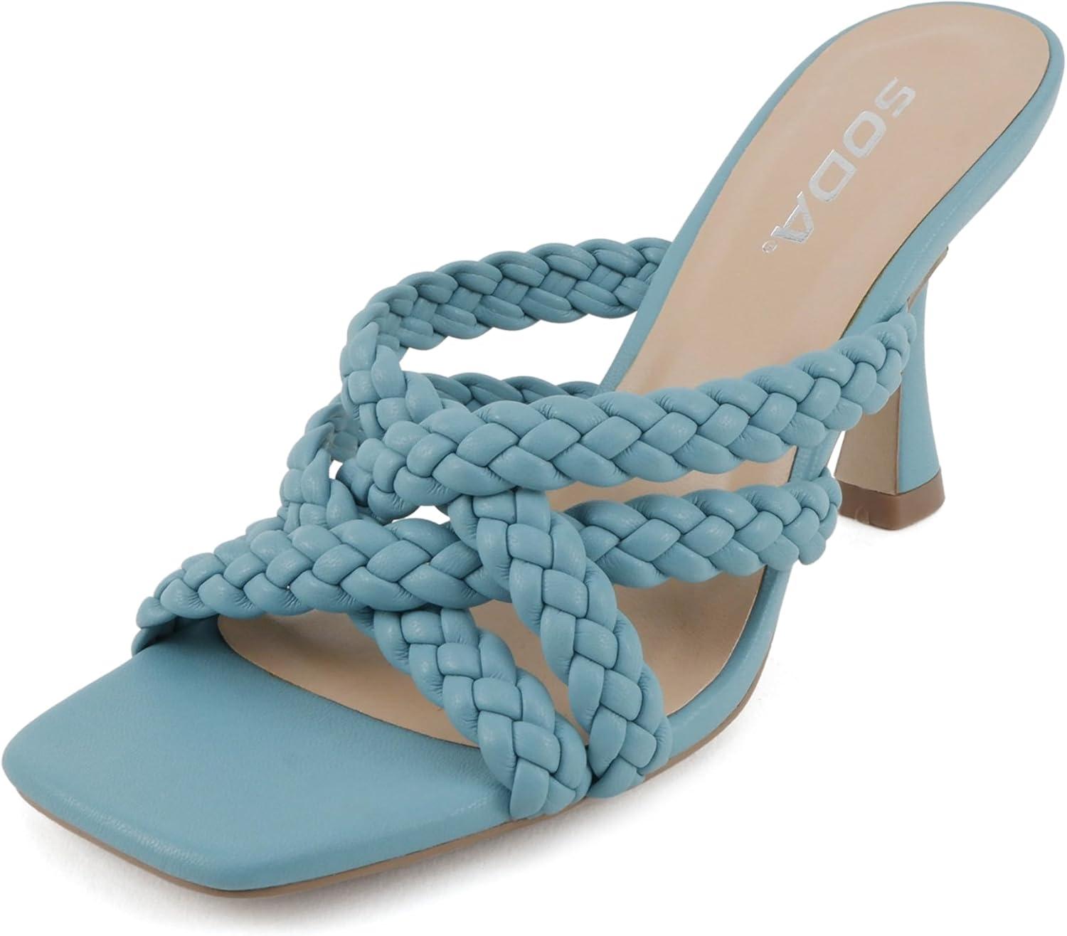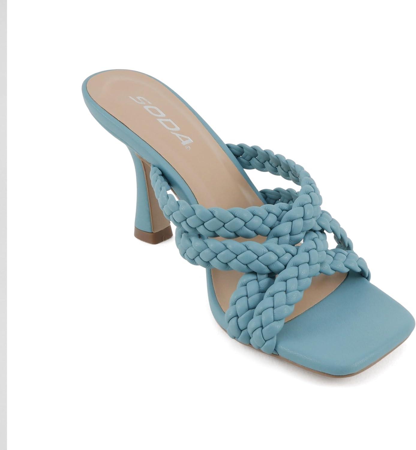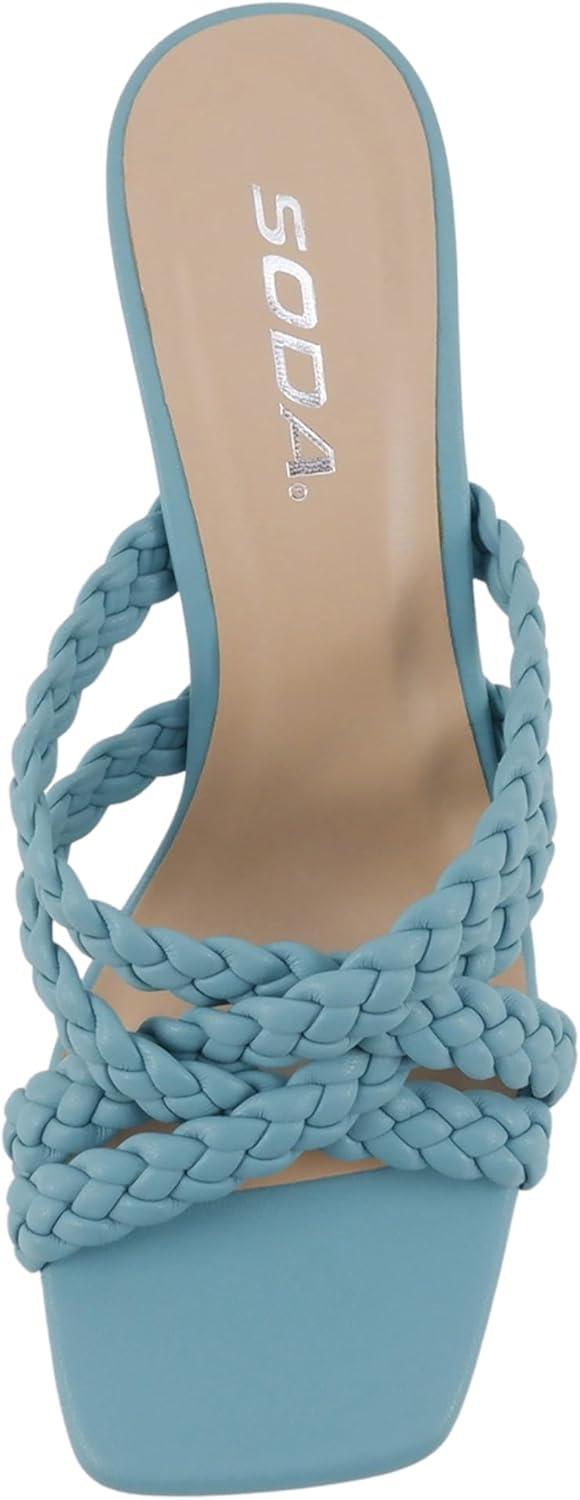 Soda “Kellan” ~ Women Square Toe Braided Multi-Strap High Kitten Heeled Sandals(Teal Pu)