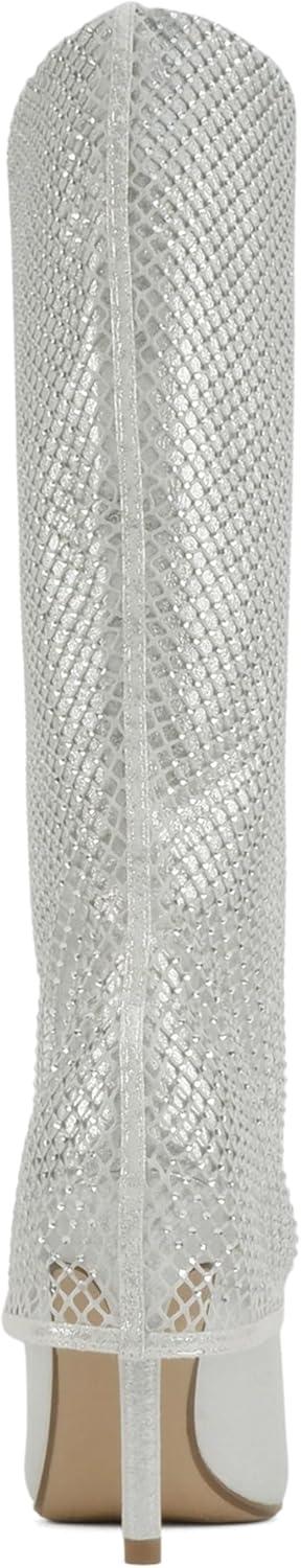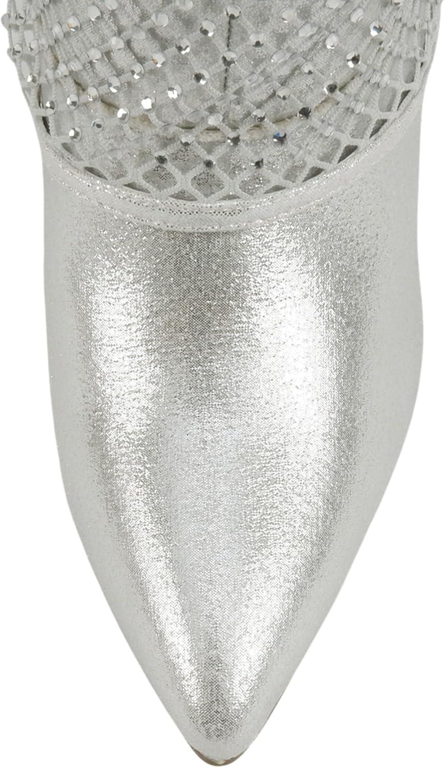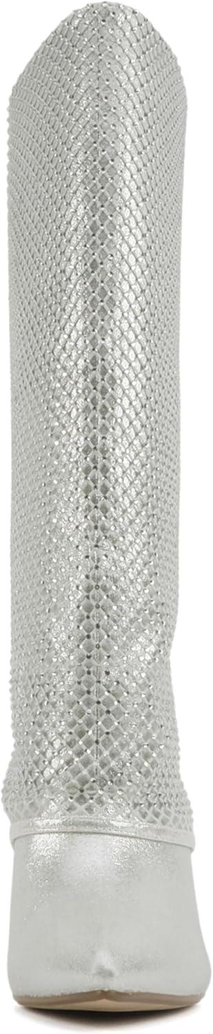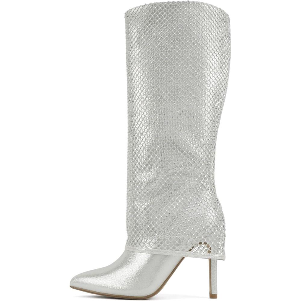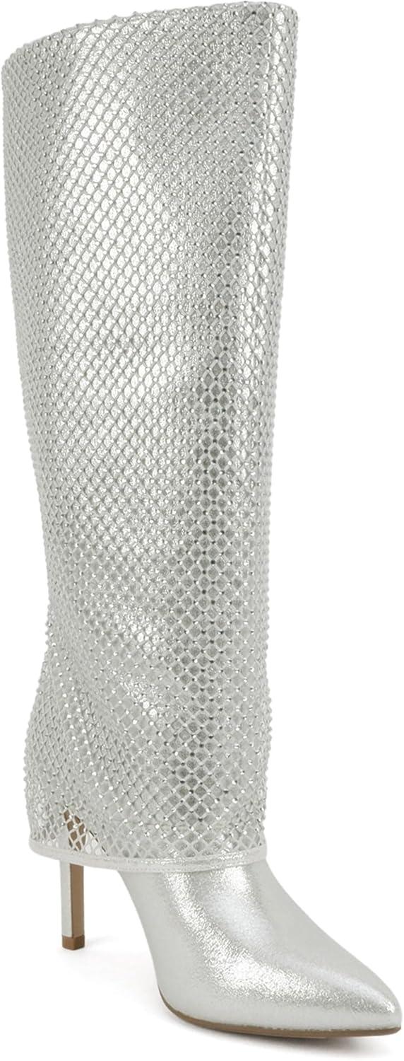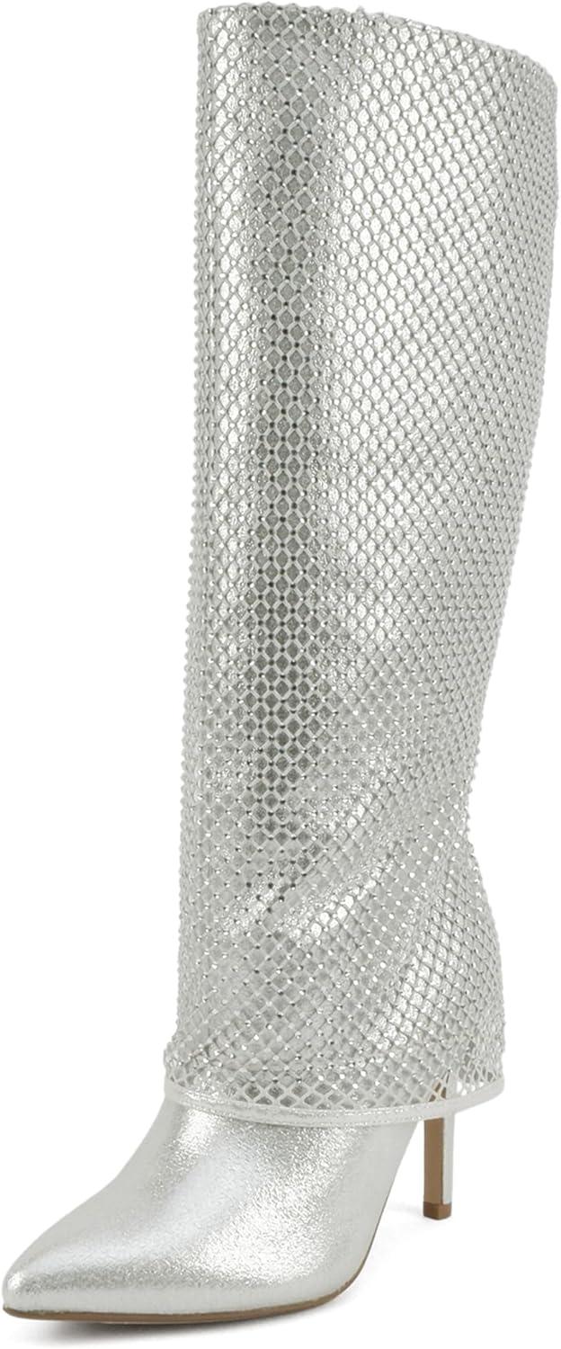 Soda “Kesara” ~ Women Pointed Toe High Heel Foldover Rhinestone Mesh Knee-High Boot(Silver)