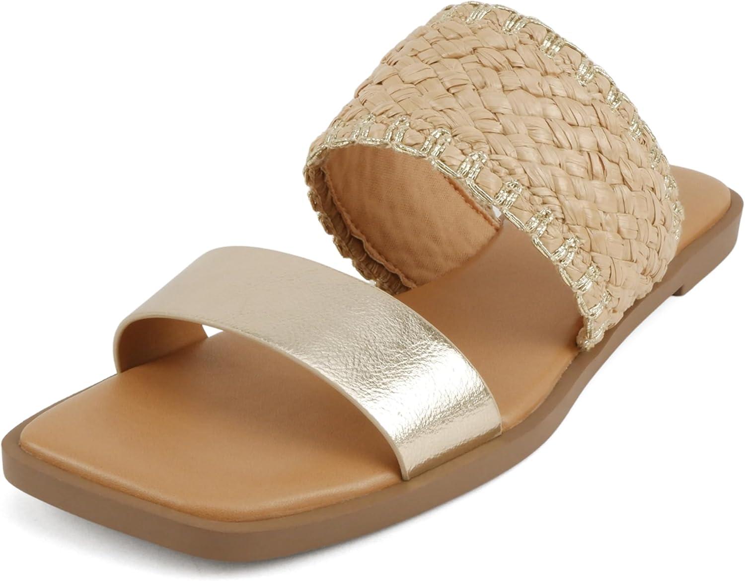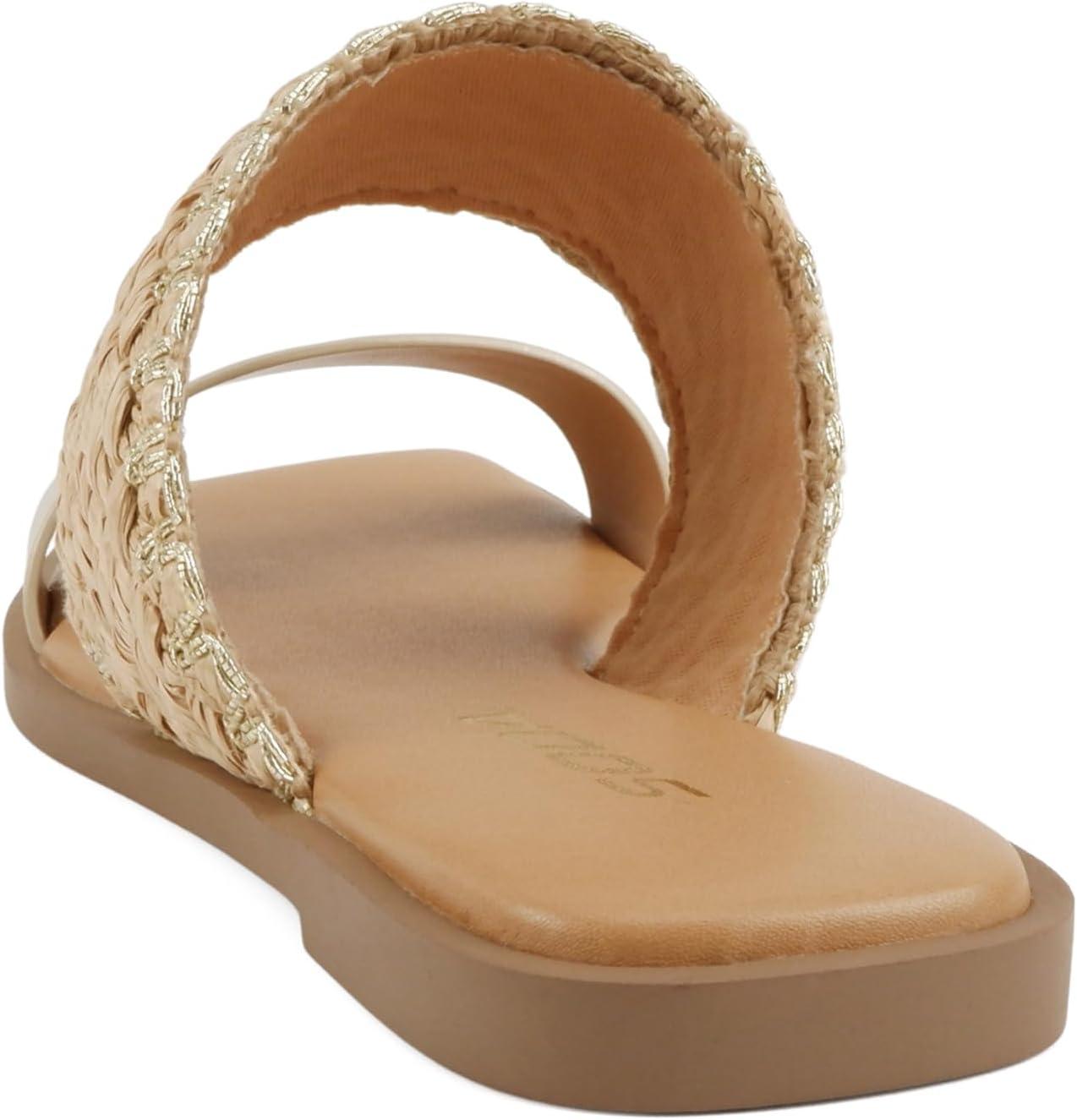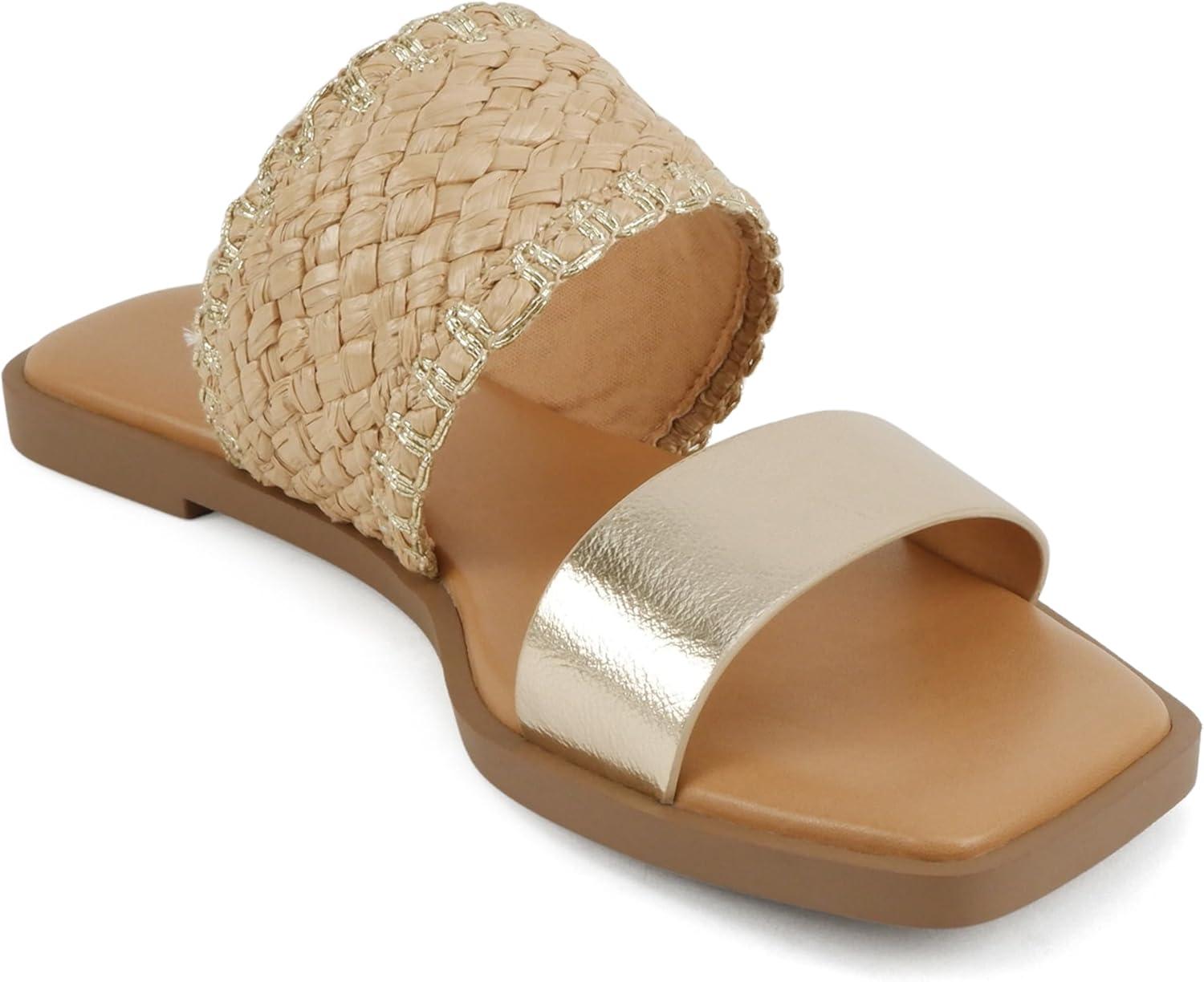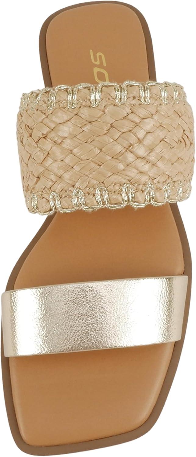 Soda Lysett ~ Women Square Toe Double Band Lug Slide Sandals(Gold/Raffia)