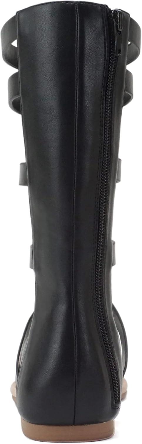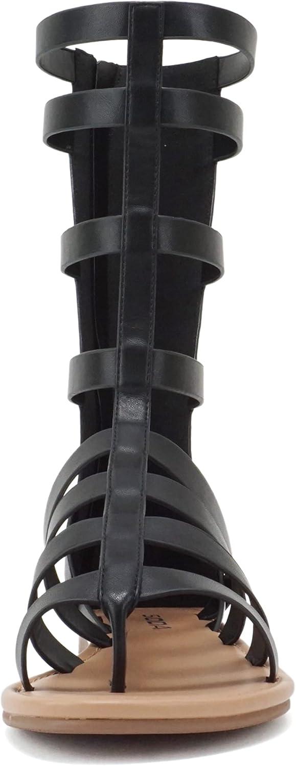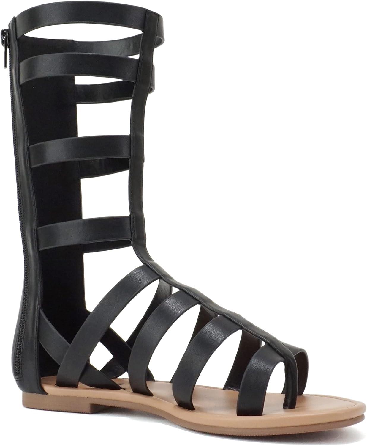 Soda MOXIE ~ Women Open Round Toe Mid-Calf Height Flat Gladiator Sandal(Black Pu)