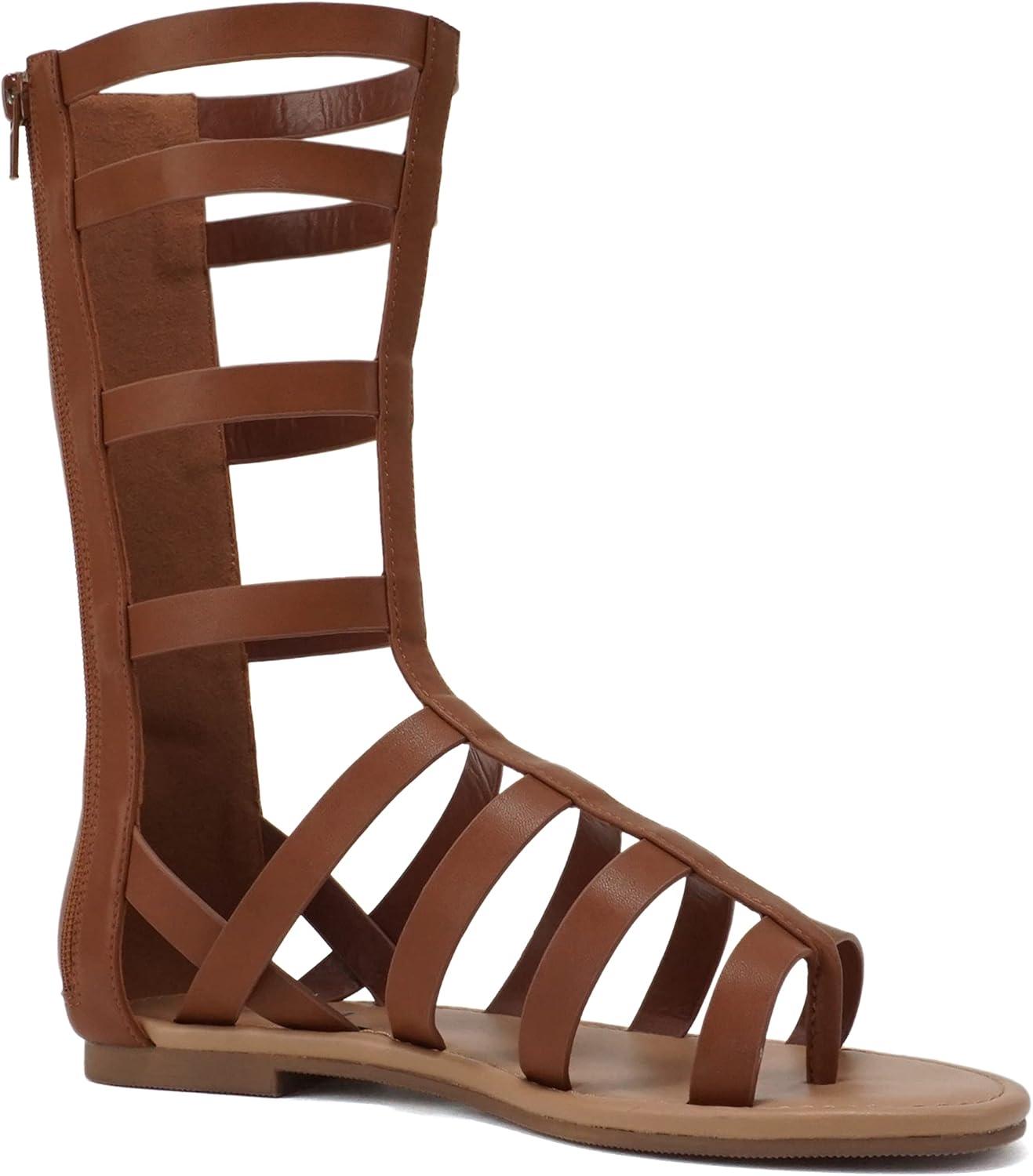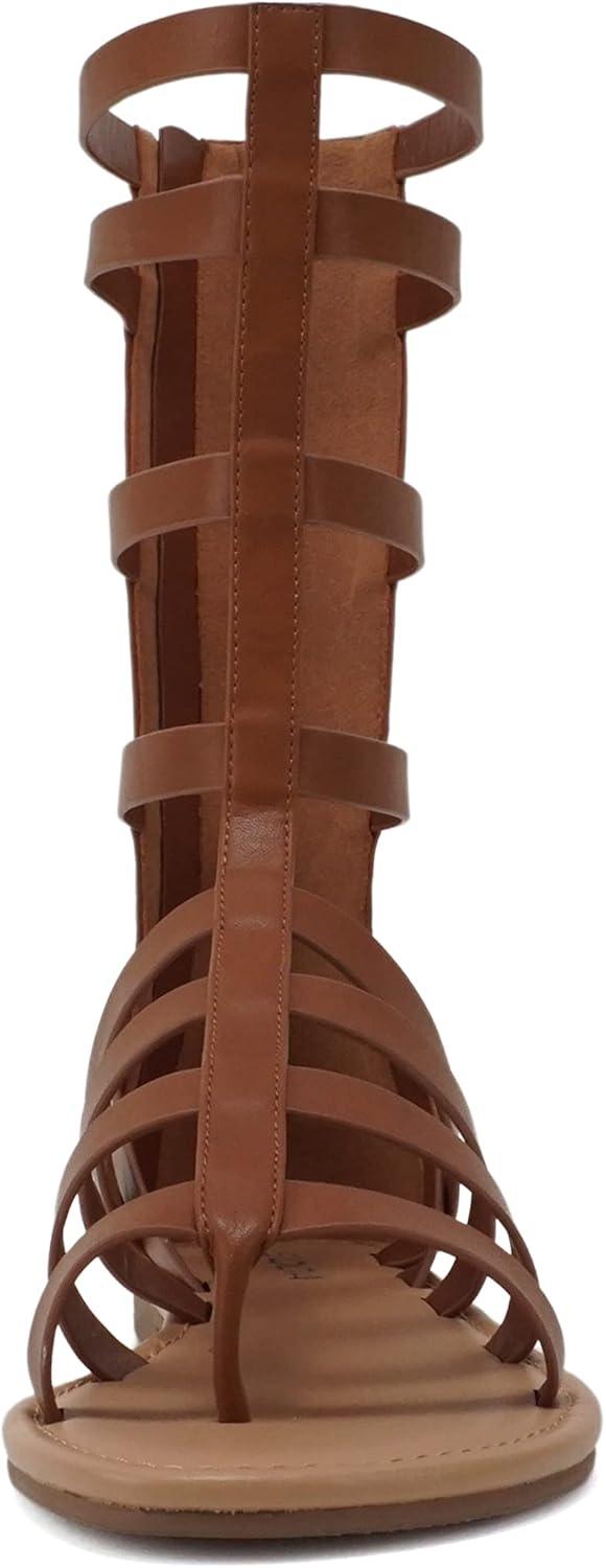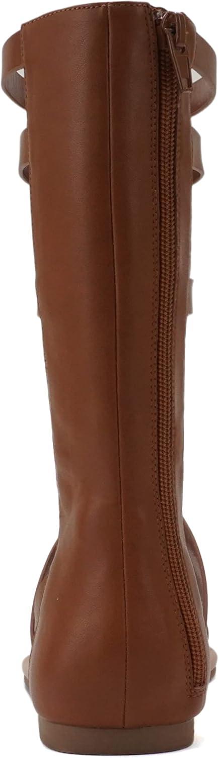 Soda MOXIE ~ Women Open Round Toe Mid-Calf Height Flat Gladiator Sandal(Cognac Pu)