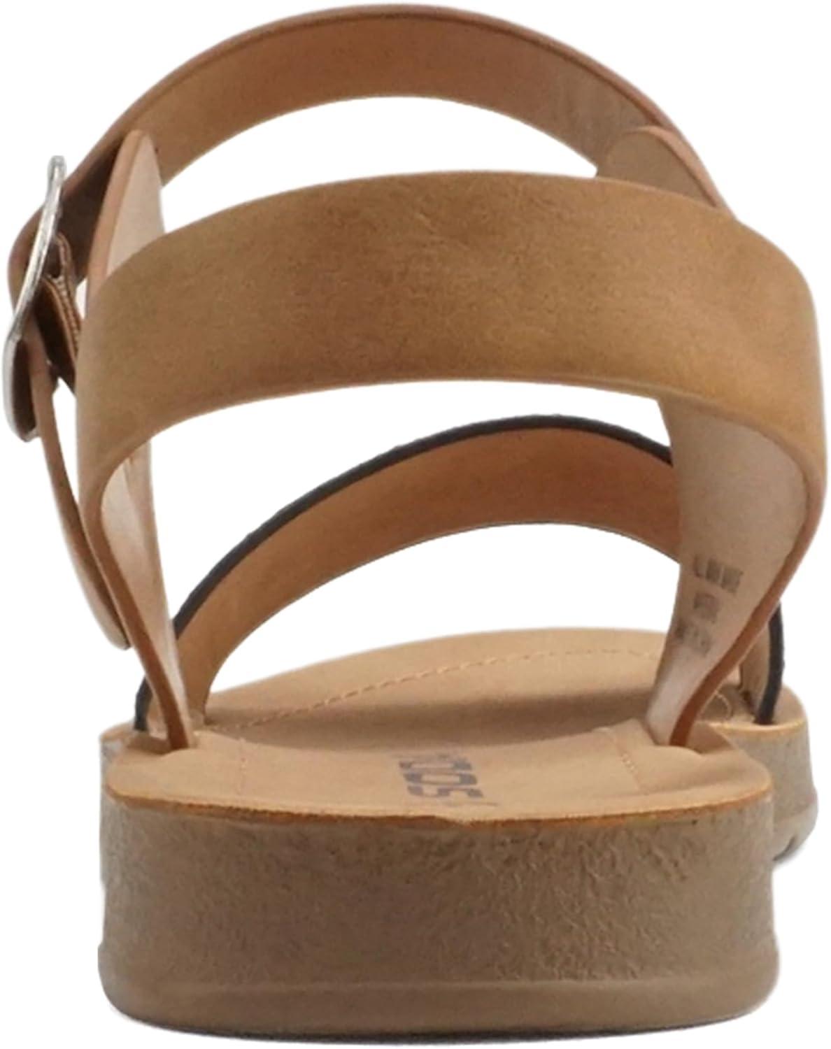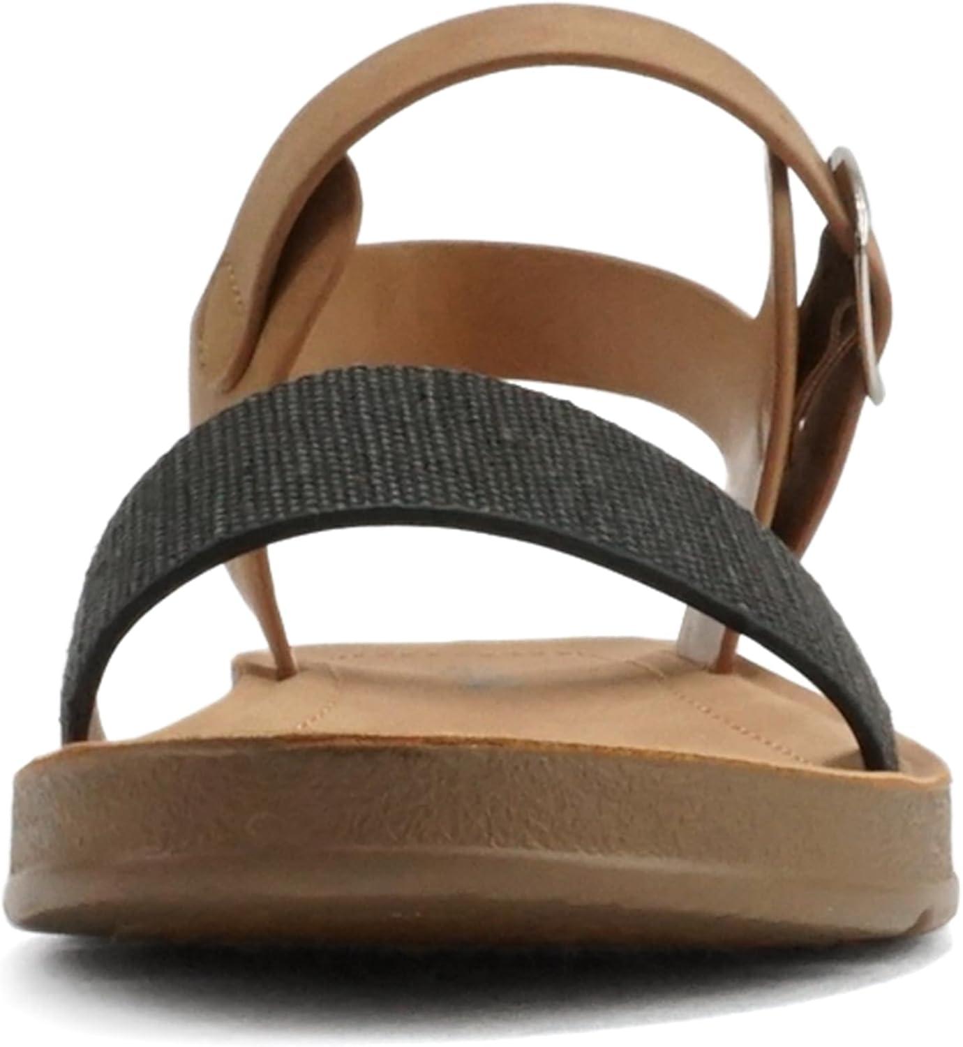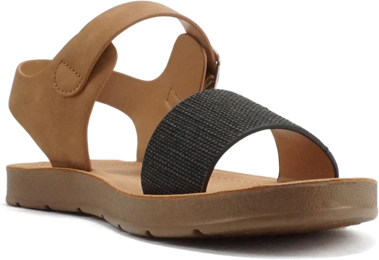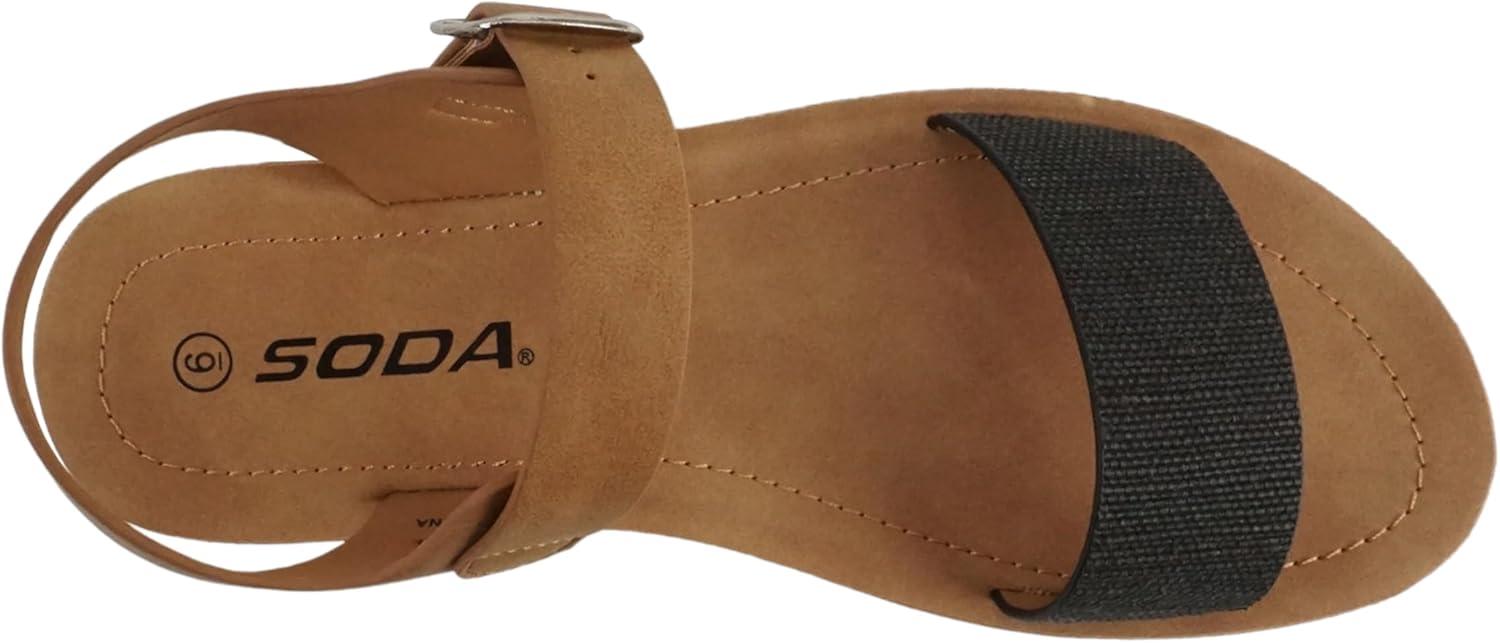 Soda PLENTY ~ Women’s Strappy Ankle Wrap Buckle Fashion Flat Sandals(Black Canvas/Tan)