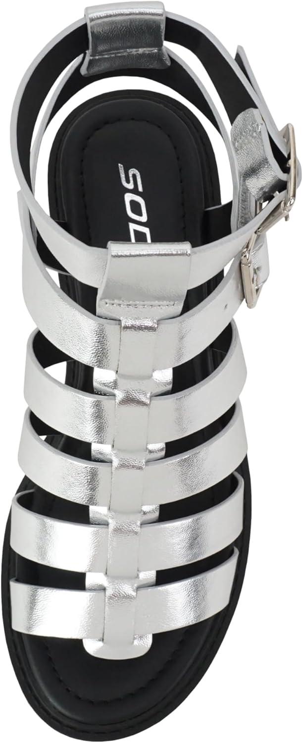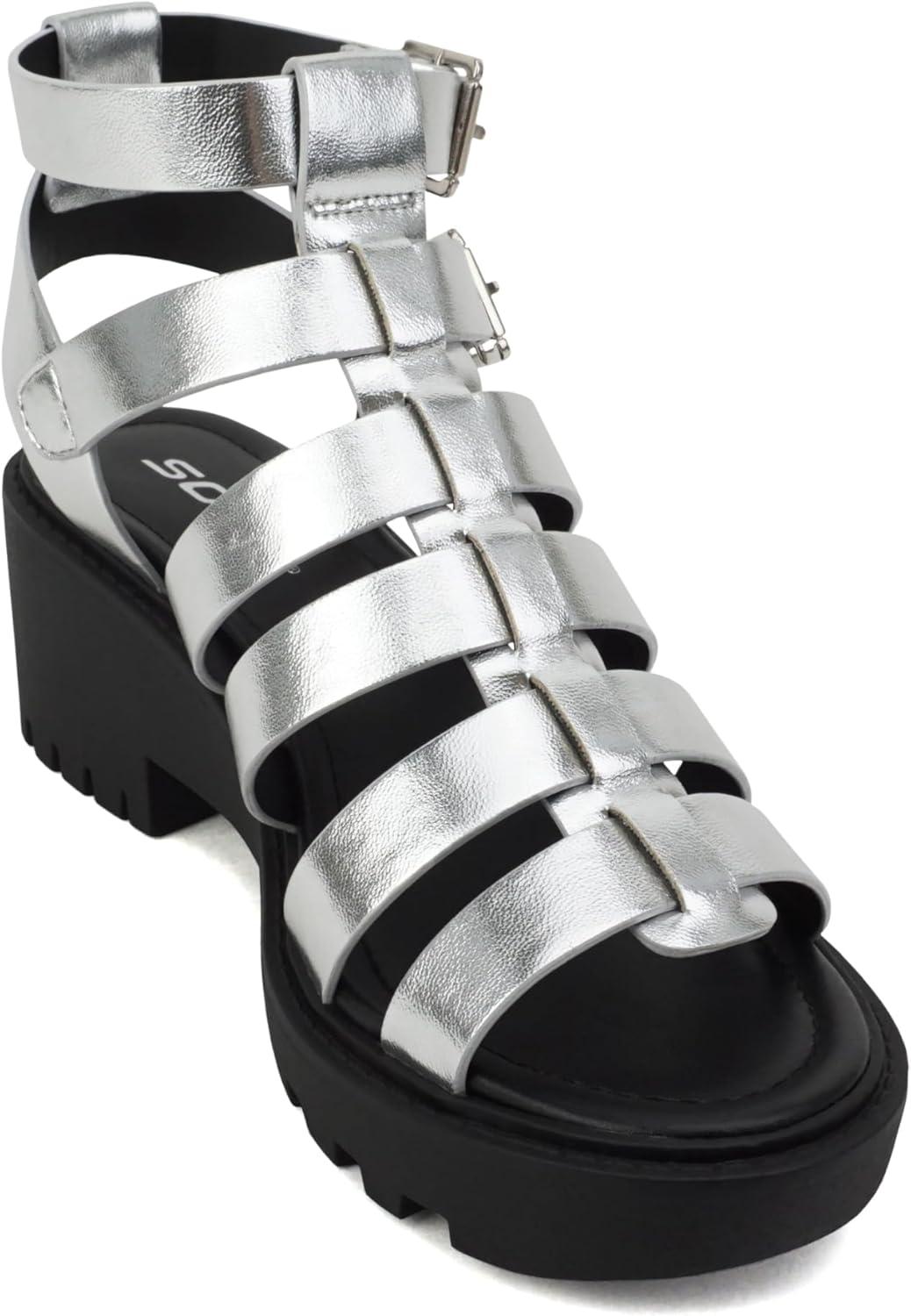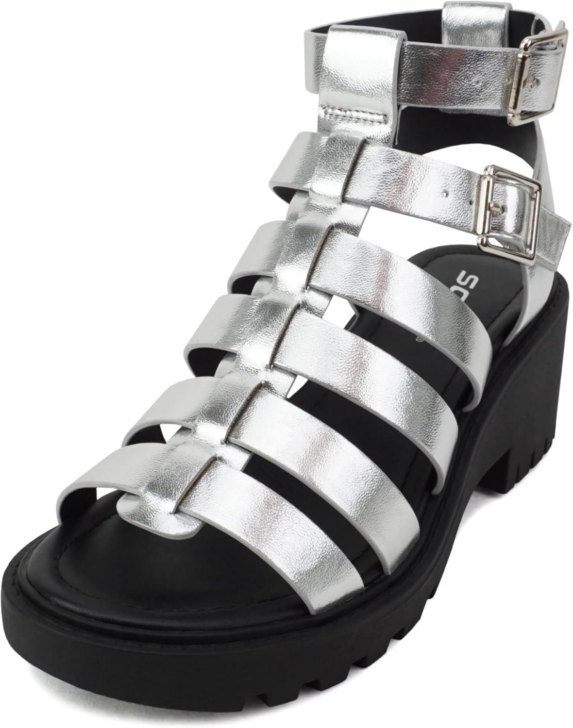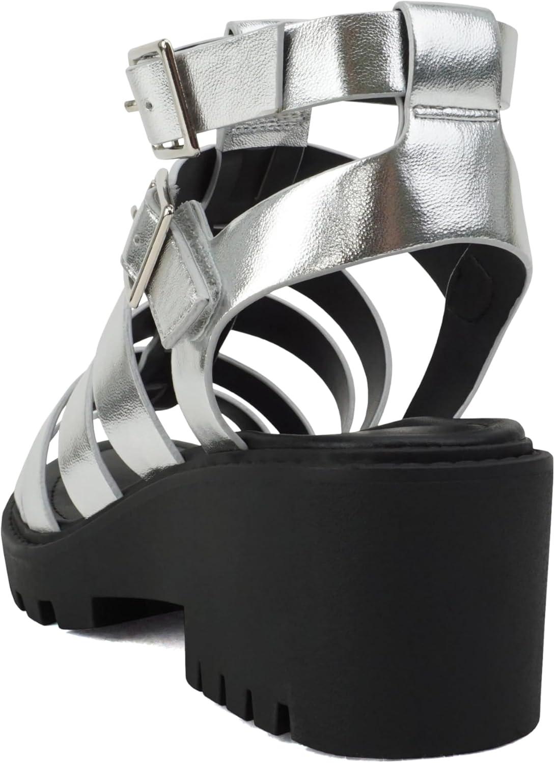 Soda “Rebirth” ~ Women Open Toe Fisherman Multi Strap Buckle Lug Sole Low Block Heeled Sandals(Silver Metallic Pu)