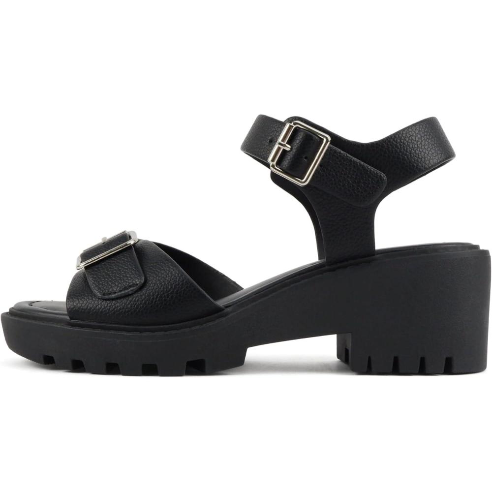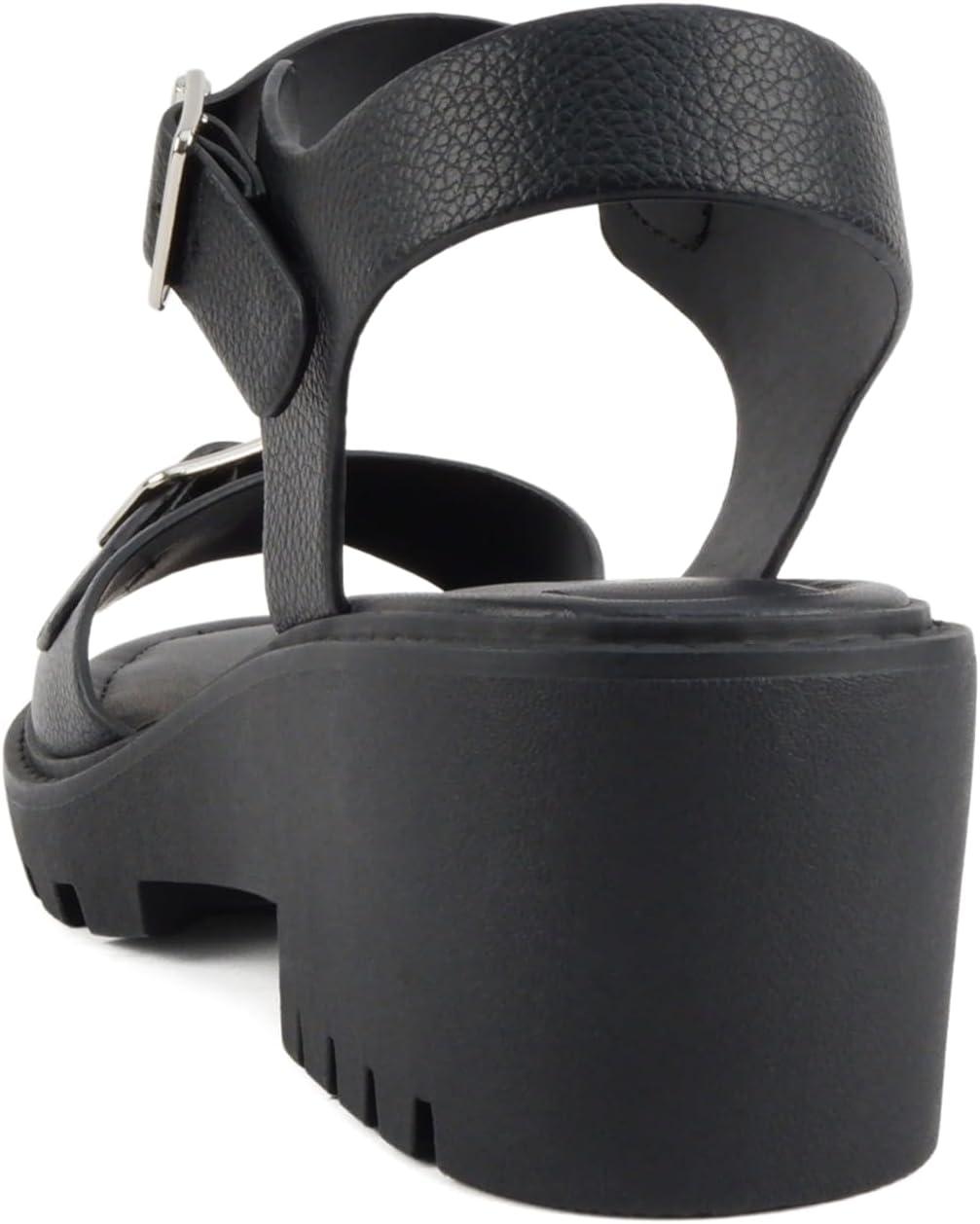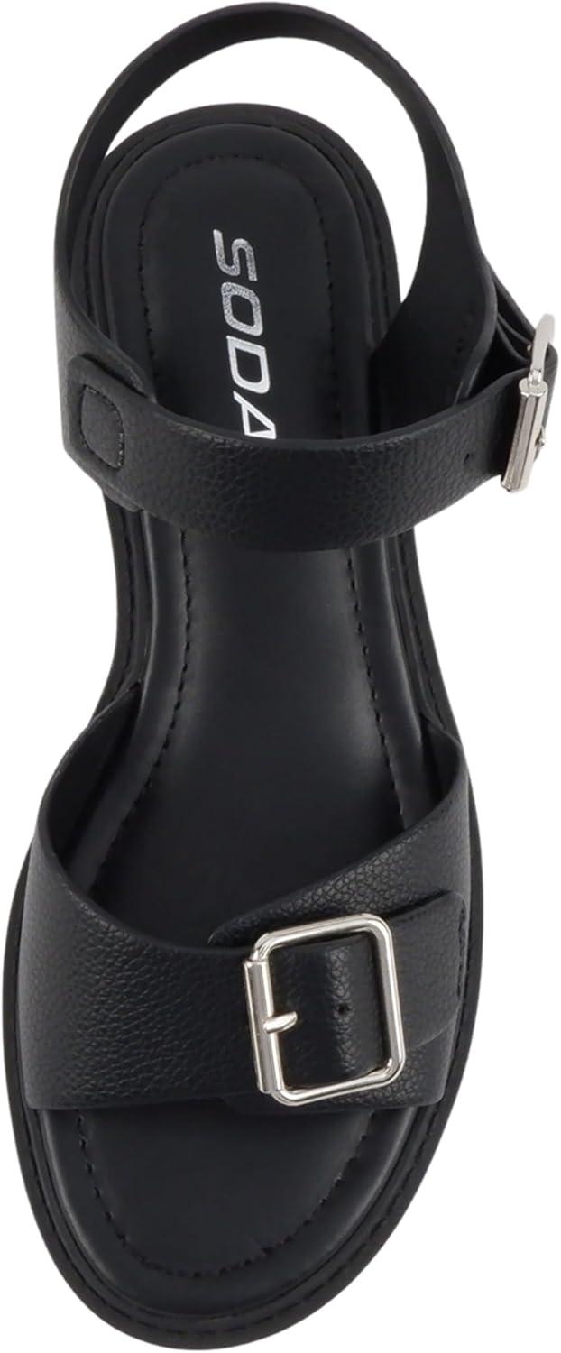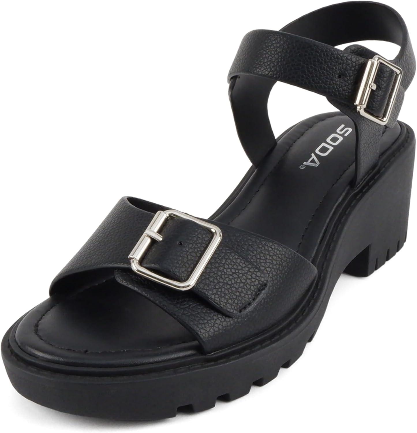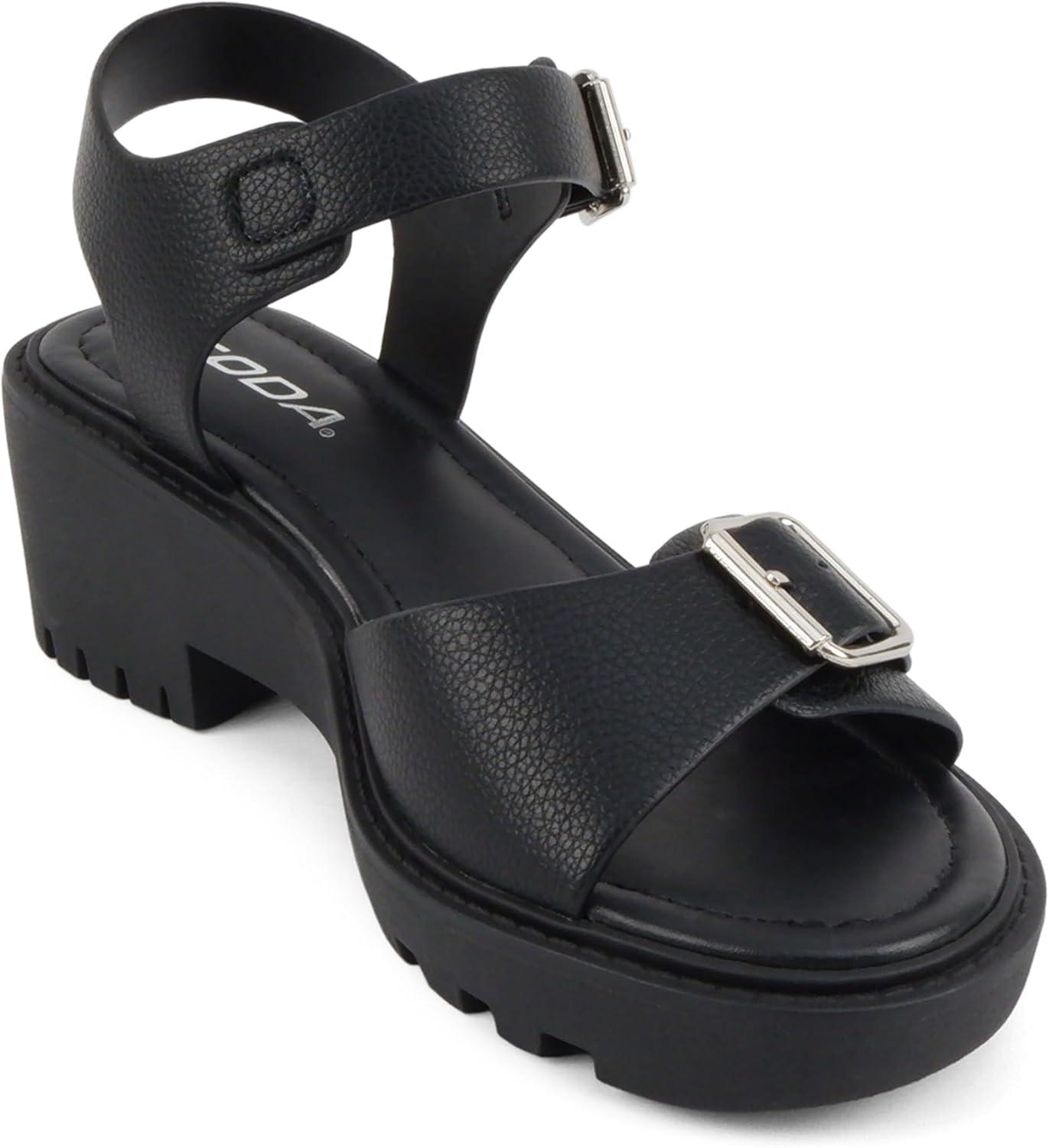 Soda Remo ~ Women Round Toe Buckle Strap Lug Sole Wedge Sandal(Black Pu)