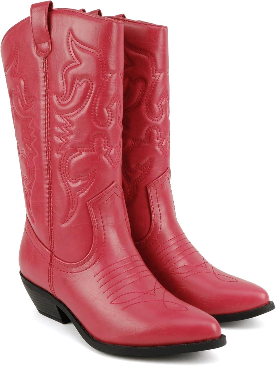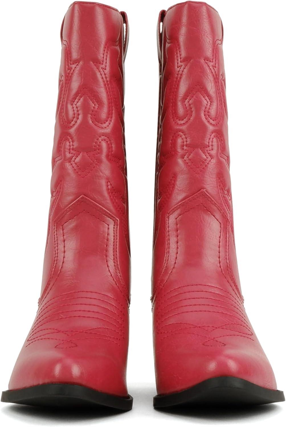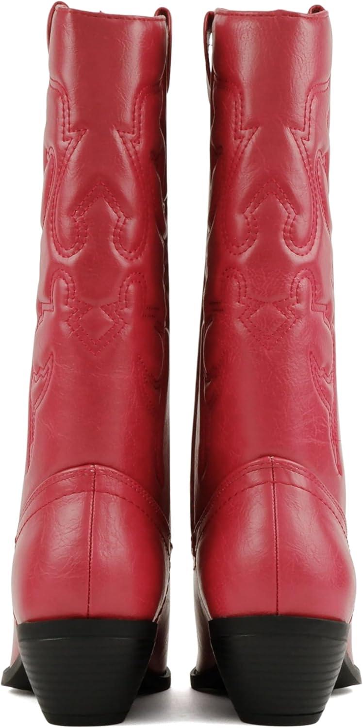 Soda “Rodeo” ~ Women’s Knee High Western Cowboy Boots with Stitched Detailing, Pointed Toe, and Low Block Heel(A-red Pu)