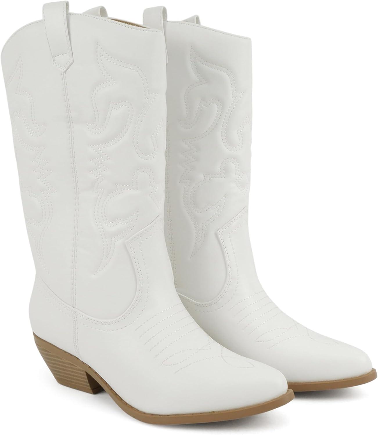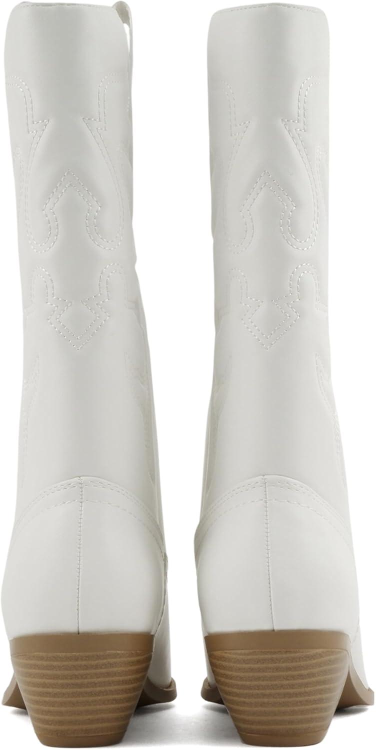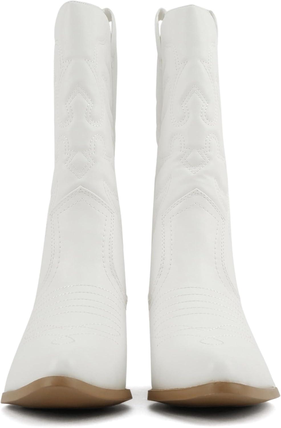 Soda “Rodeo” ~ Women’s Knee High Western Cowboy Boots with Stitched Detailing, Pointed Toe, and Low Block Heel(A-wht/Bge Pu)