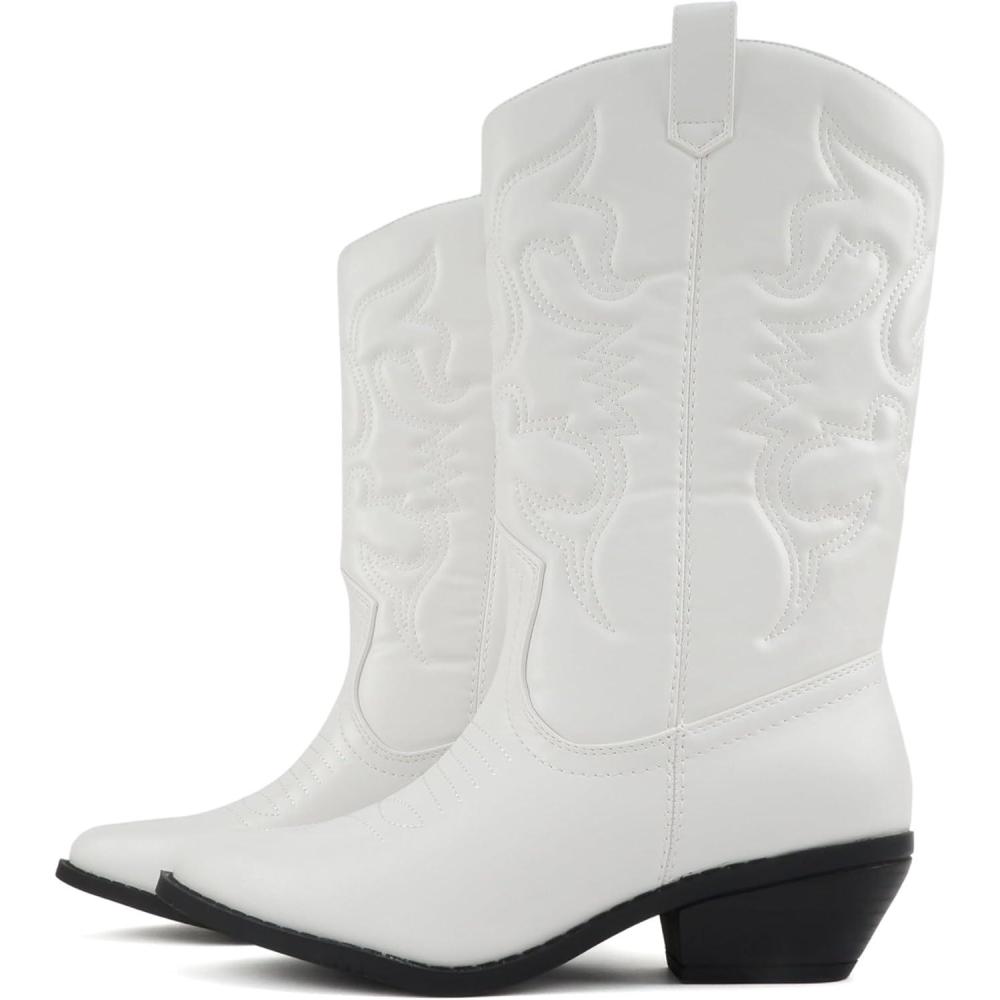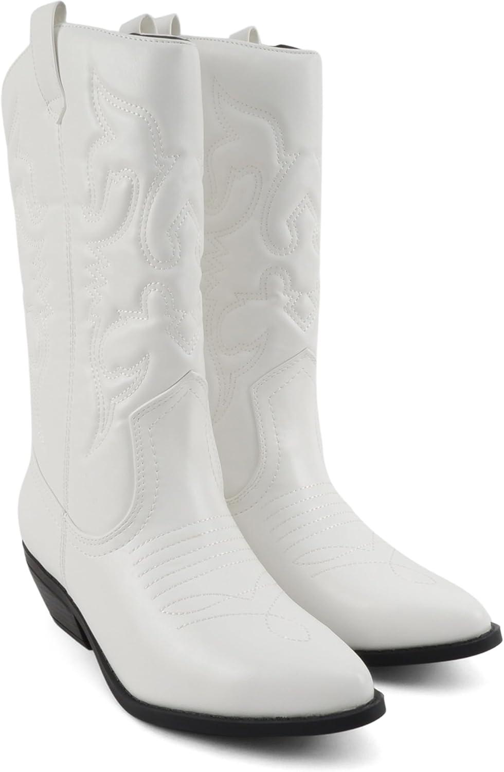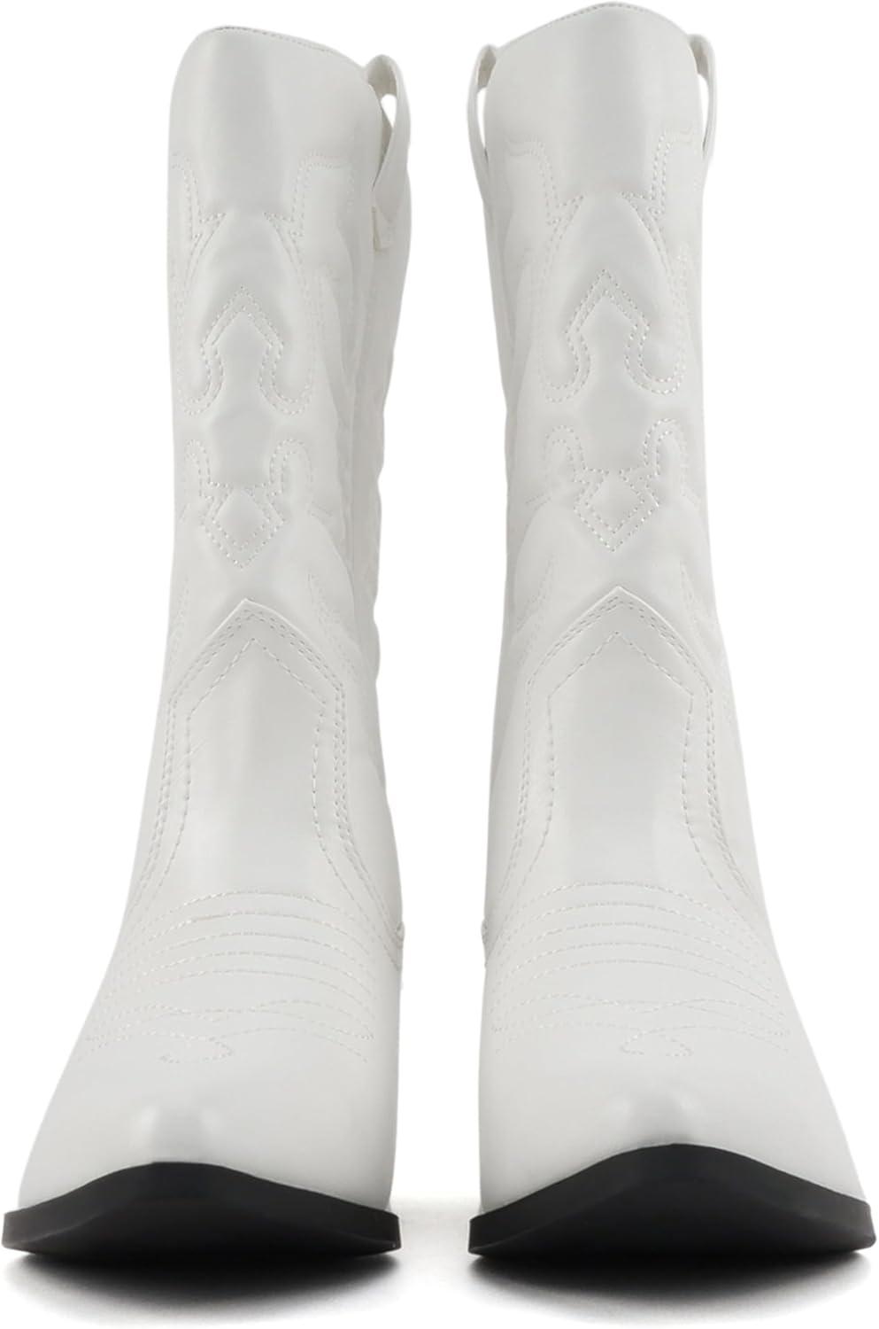 Soda “Rodeo” ~ Women’s Knee High Western Cowboy Boots with Stitched Detailing, Pointed Toe, and Low Block Heel(A-wht/Black Pu)