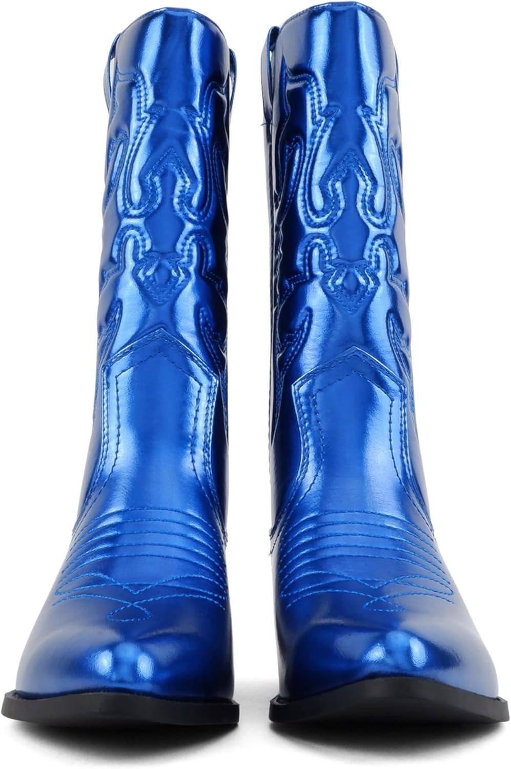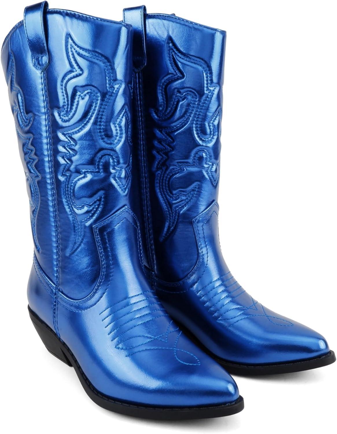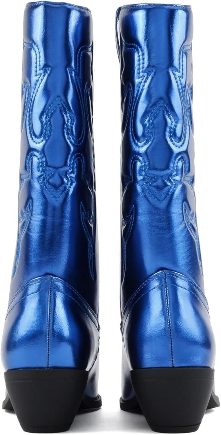 Soda “Rodeo” ~ Women’s Knee High Western Cowboy Boots with Stitched Detailing, Pointed Toe, and Low Block Heel(C-blue Met)
