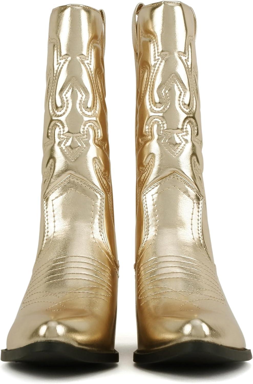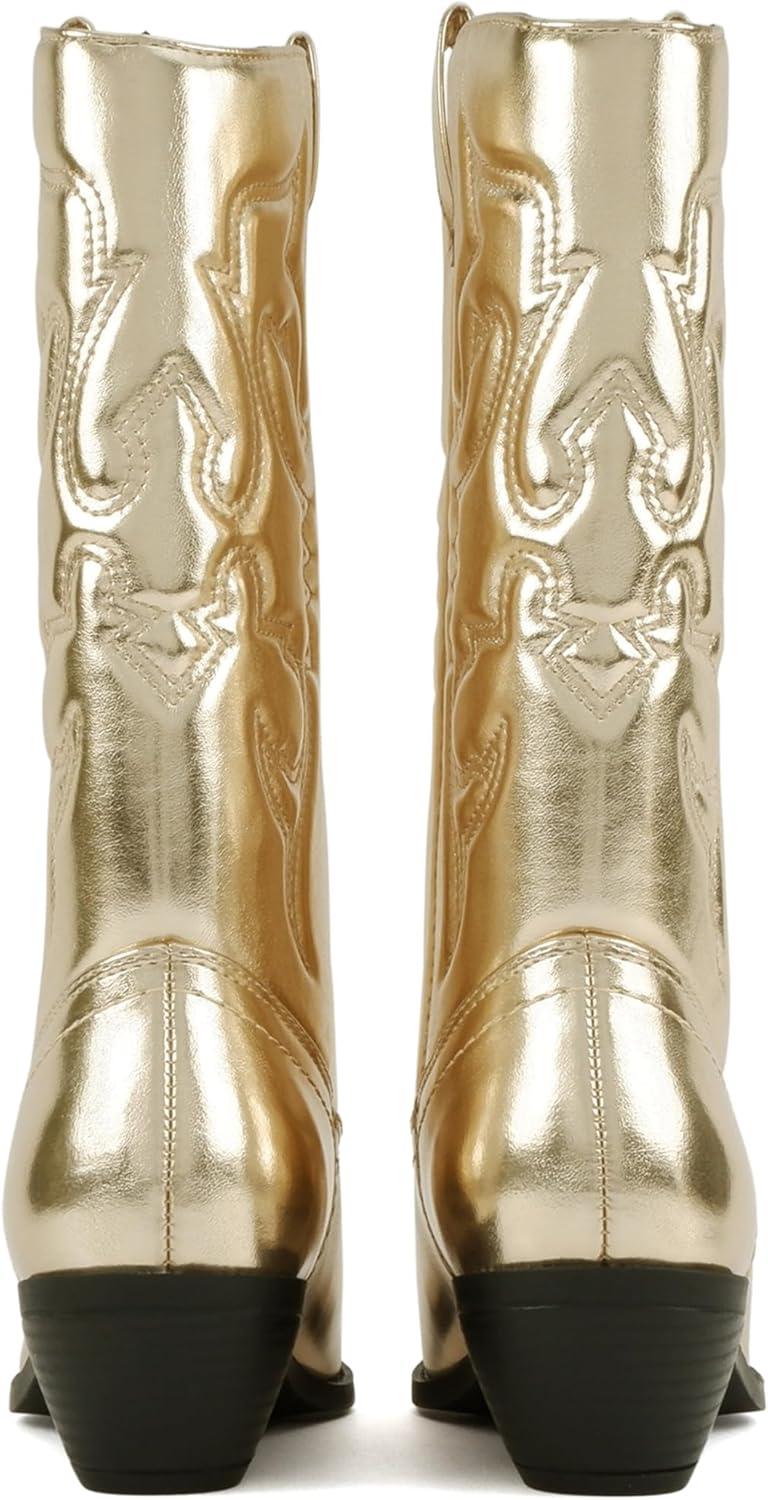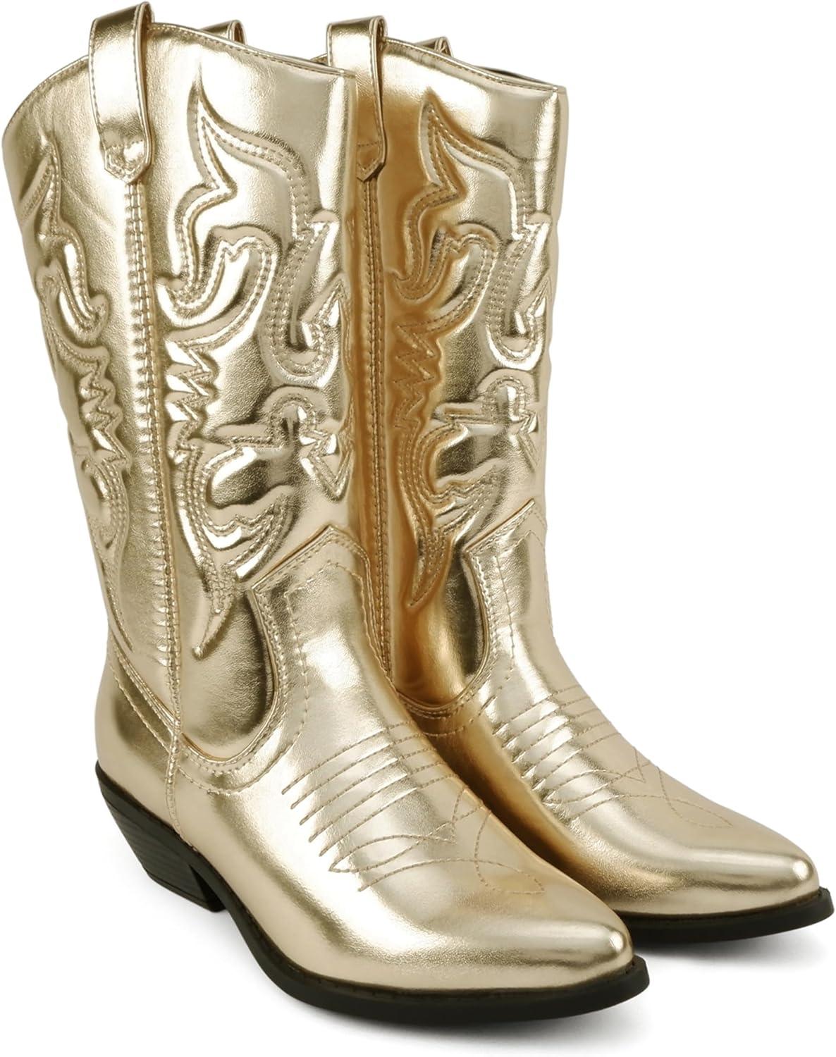 Soda “Rodeo” ~ Women’s Knee High Western Cowboy Boots with Stitched Detailing, Pointed Toe, and Low Block Heel(C-gold Met)
