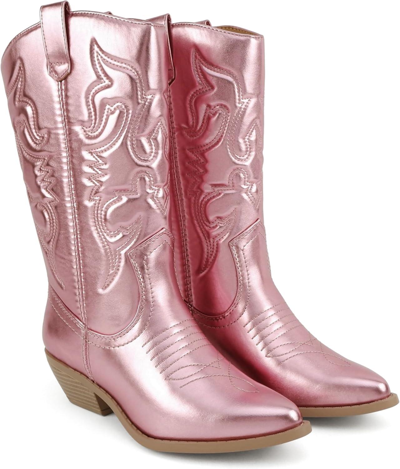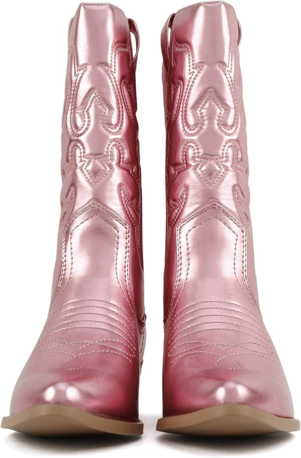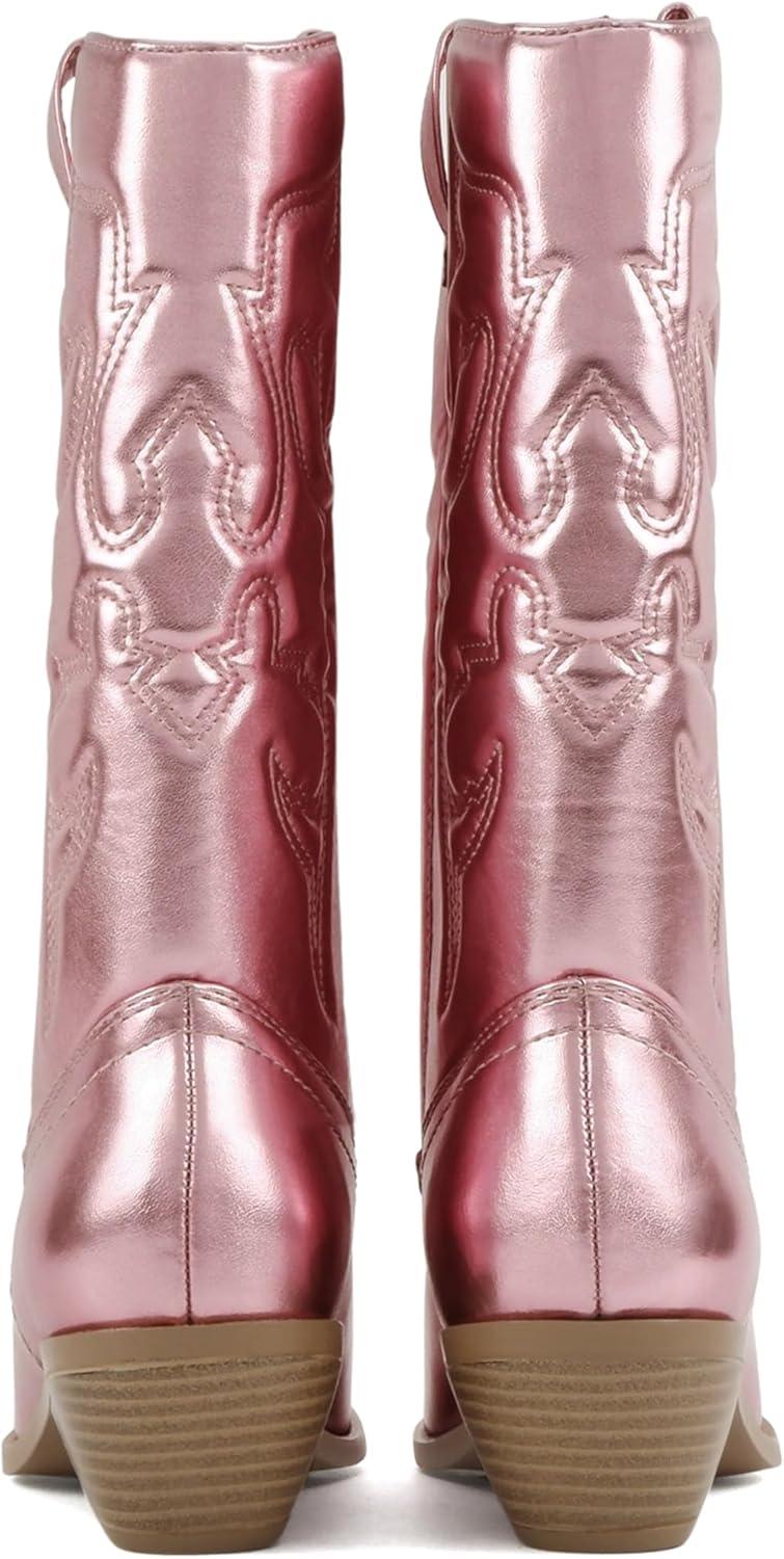 Soda “Rodeo” ~ Women’s Knee High Western Cowboy Boots with Stitched Detailing, Pointed Toe, and Low Block Heel(C-lt Pink Met)