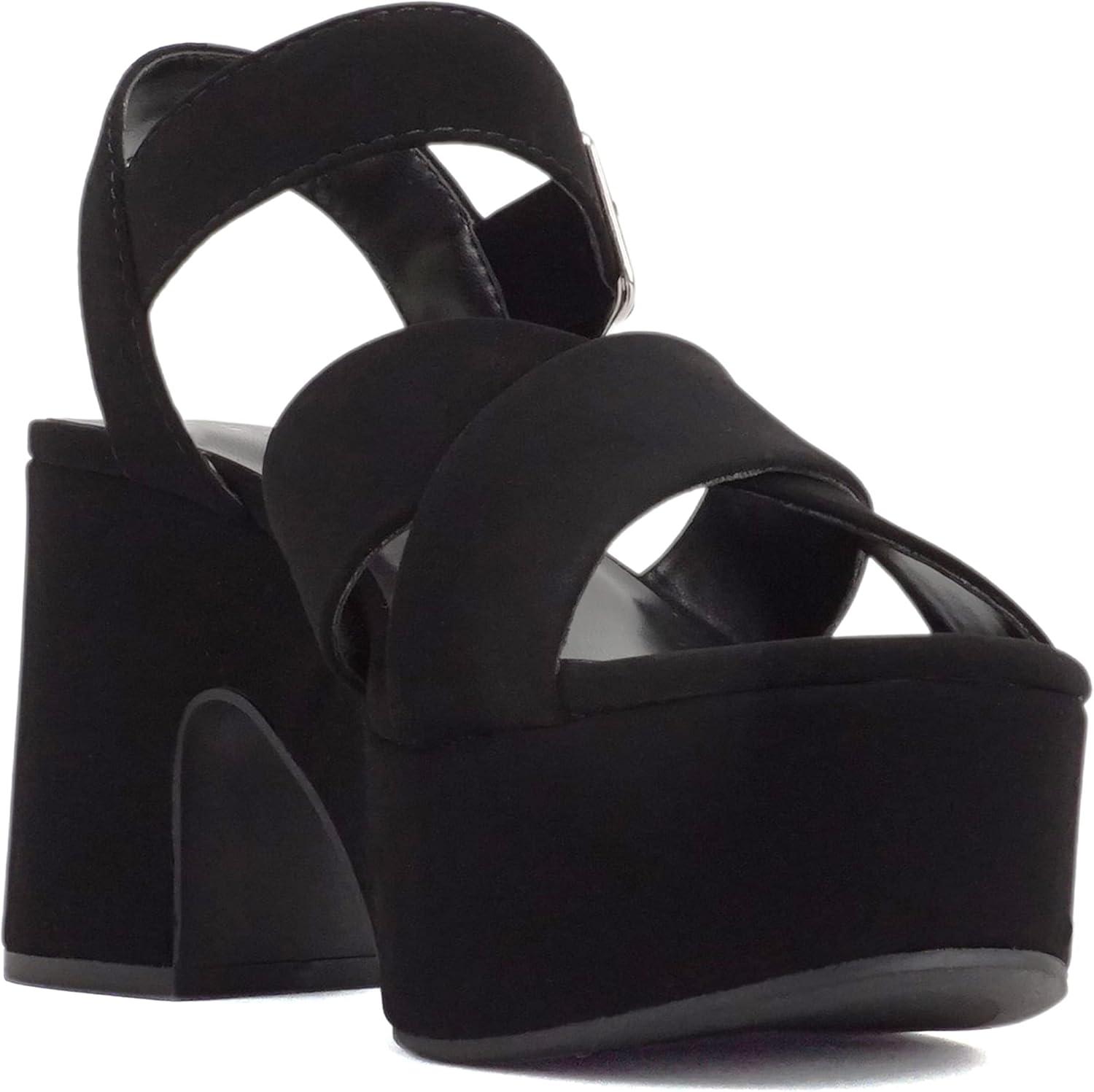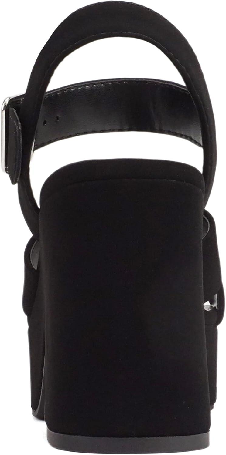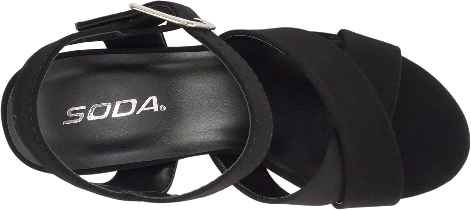 Soda “SYREN” ~ Women Open Round Toe Crisscross Band Ankle Strap Buckle High Heel Notch Wedge Sandal(Black Nubuck)