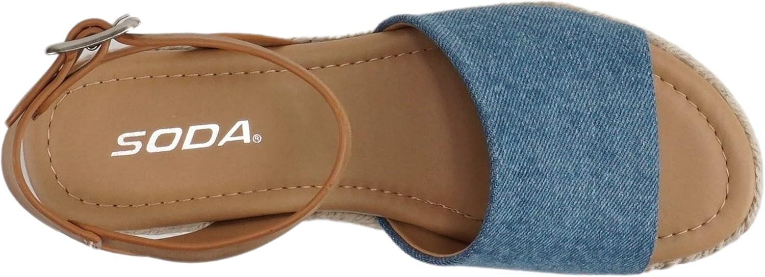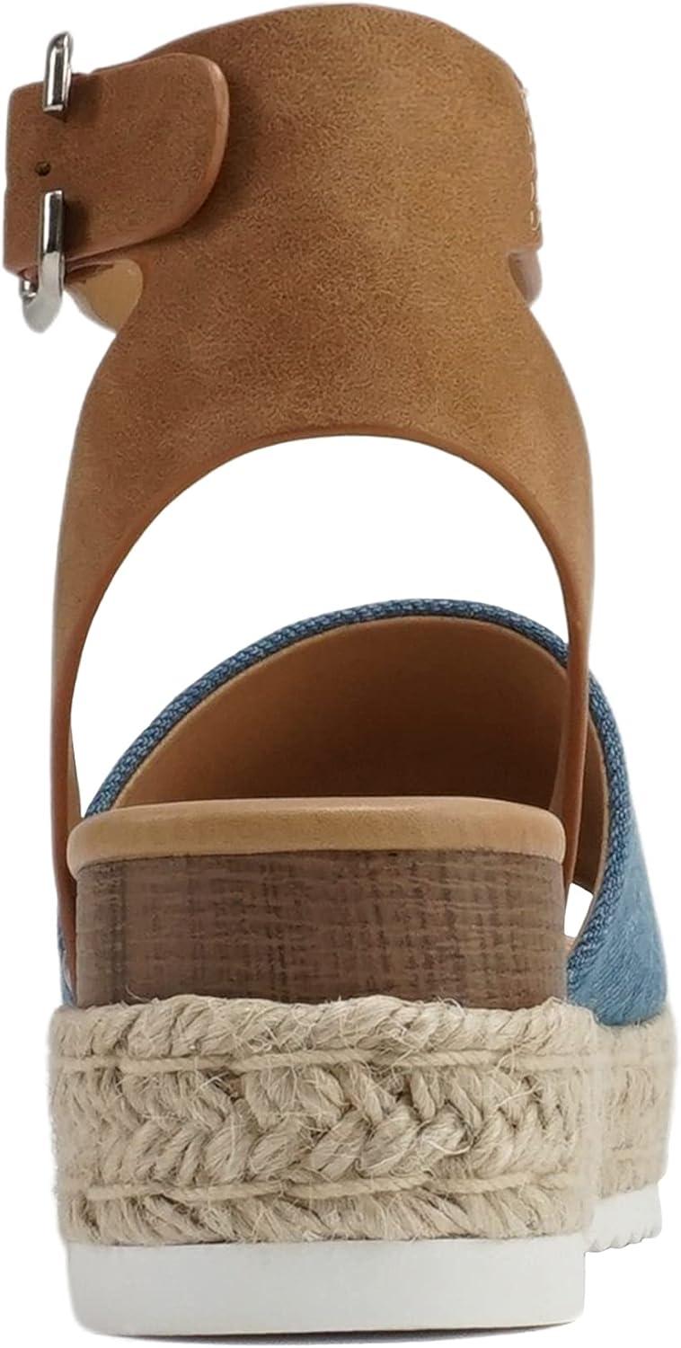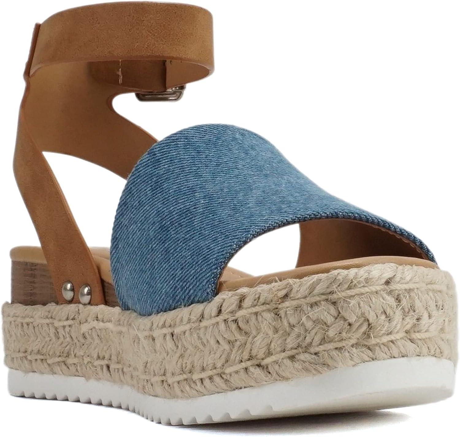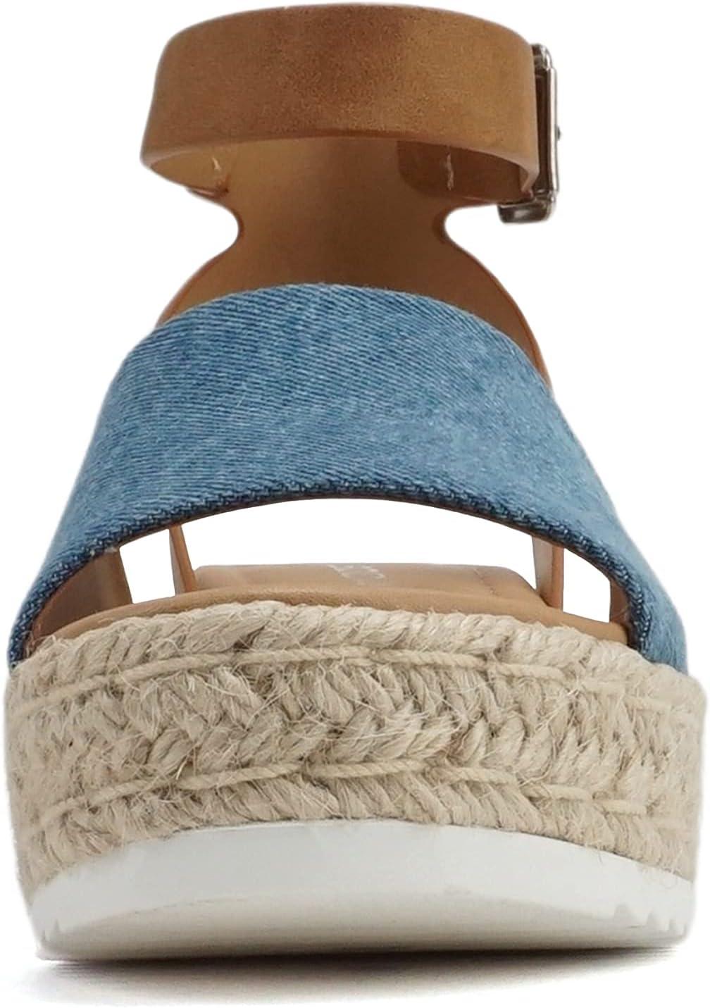 Soda Topic Open Toe Buckle Ankle Strap Espadrilles Flatform Wedge Casual Sandal(Denim/Tan)