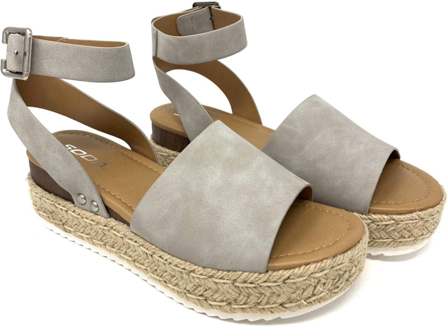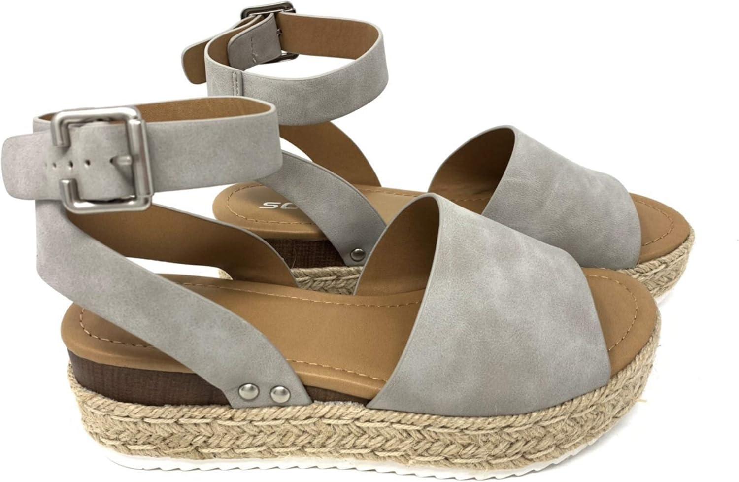 Soda Topic Open Toe Buckle Ankle Strap Espadrilles Flatform Wedge Casual Sandal(Grey T)