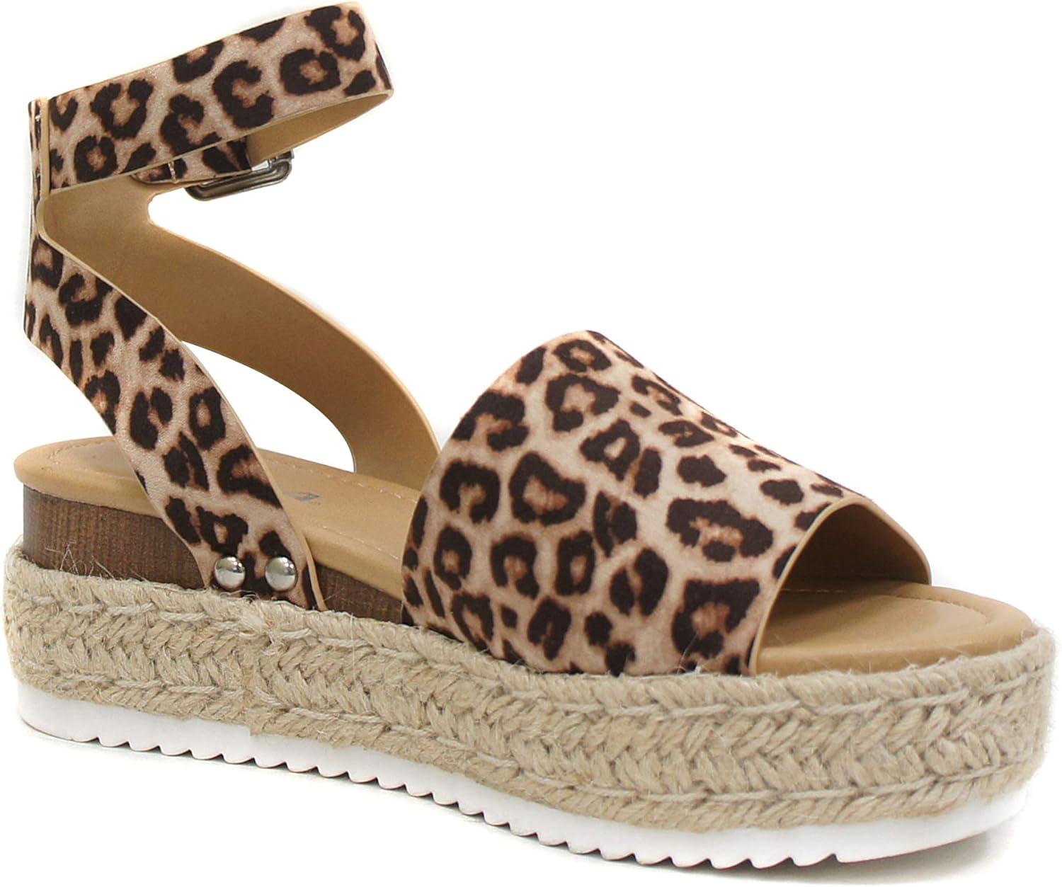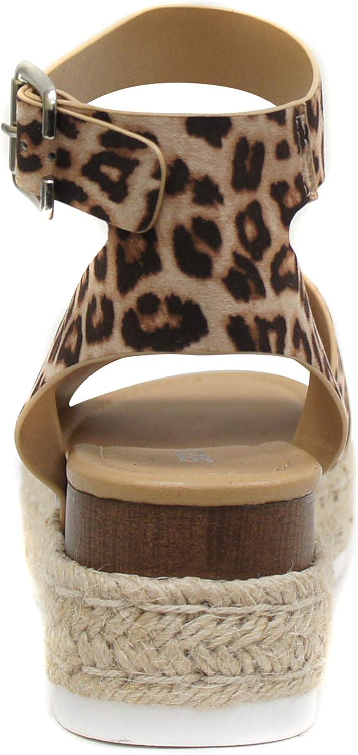 Soda Topic Open Toe Buckle Ankle Strap Espadrilles Flatform Wedge Casual Sandal(Oat Cheeta)
