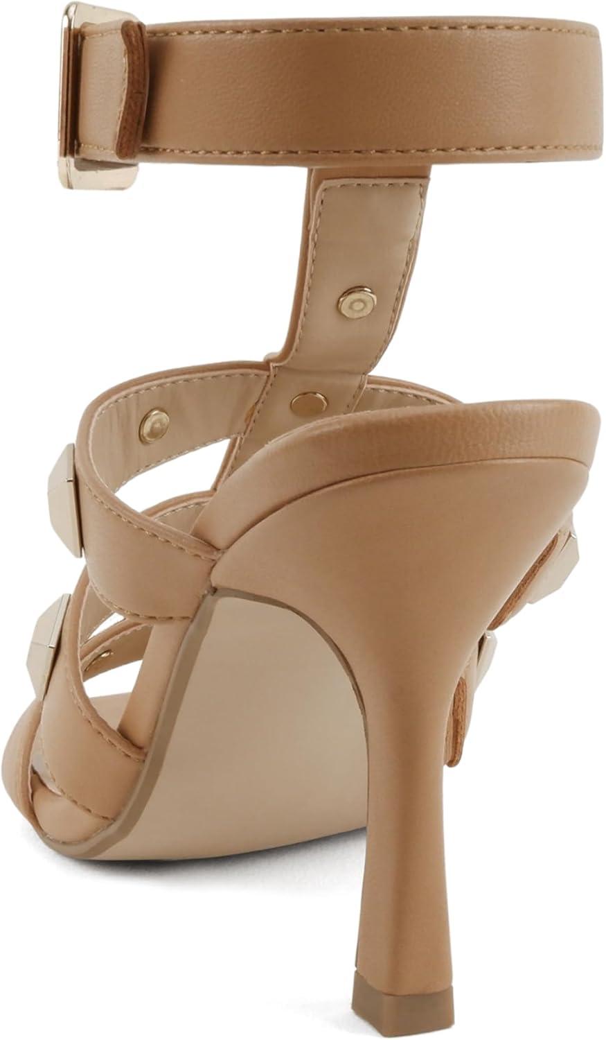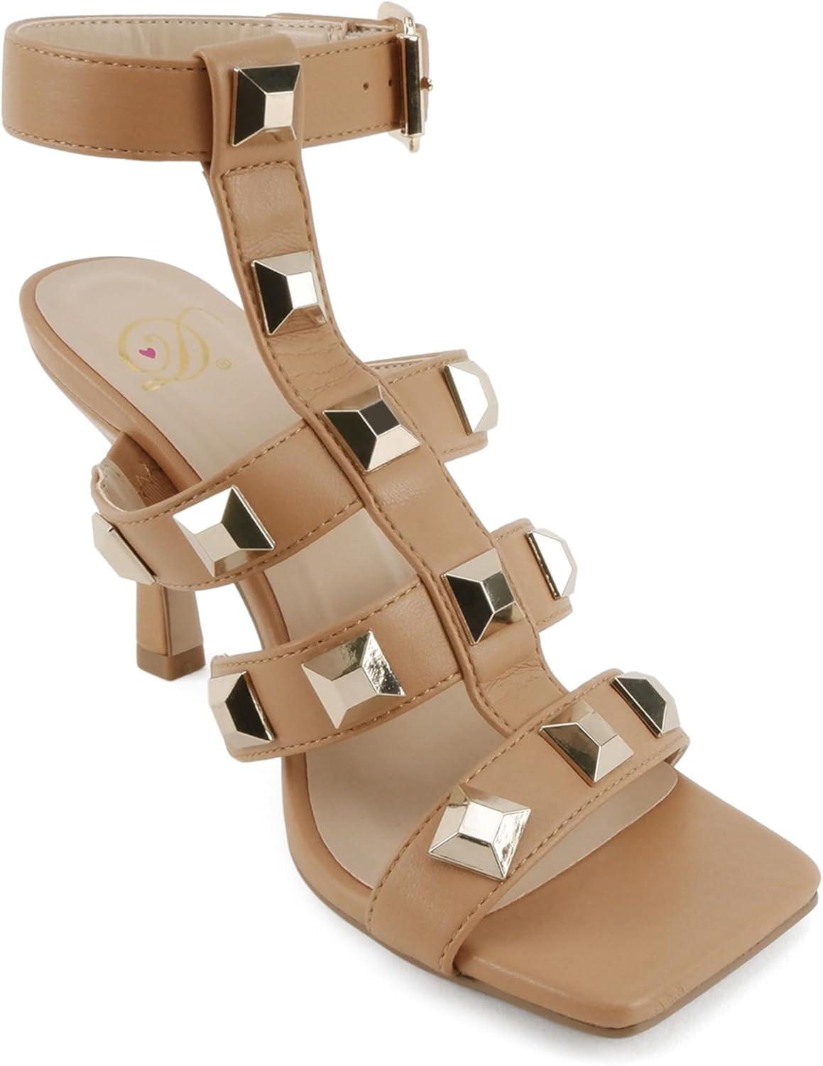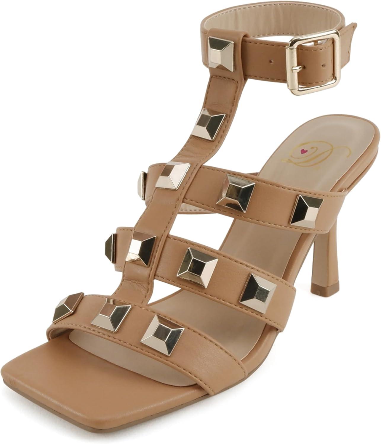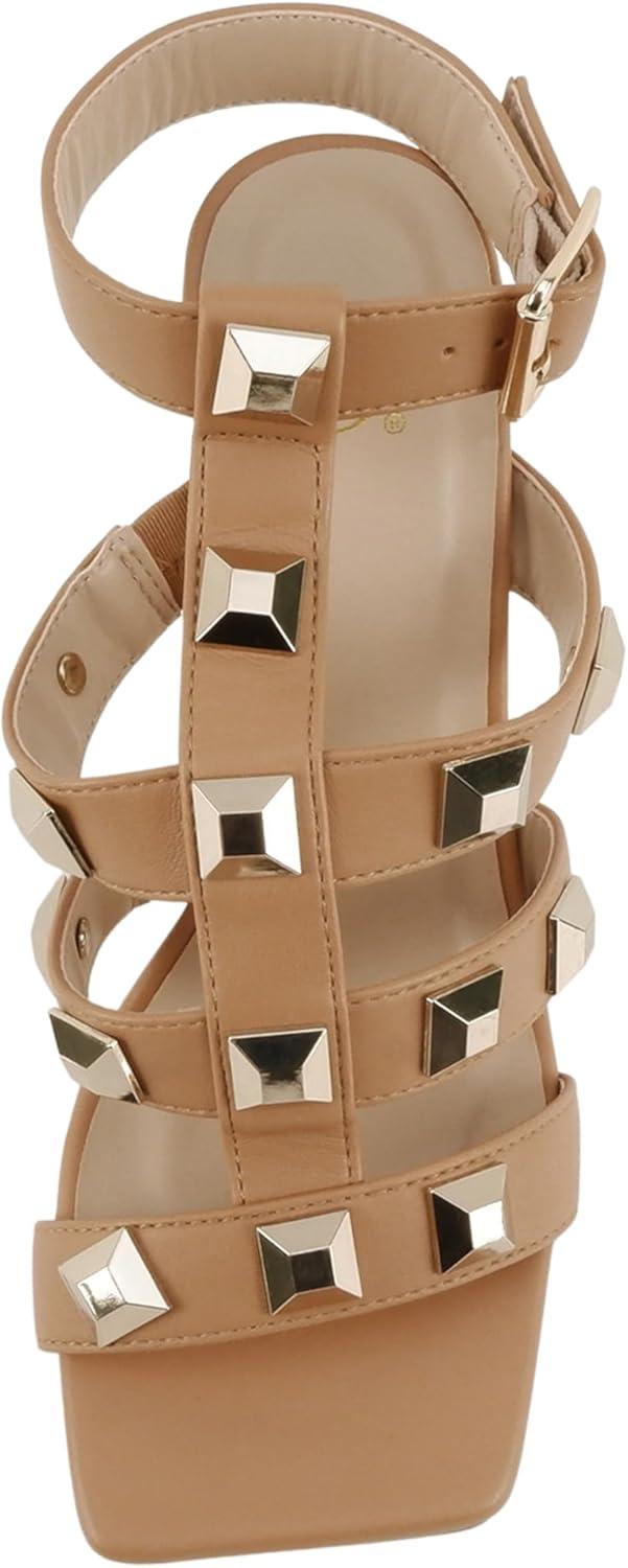 Soda “Upton” ~ Women Square Toe Studded Multi-Strap High Heeled Fisherman Sandals(Camel Pu)