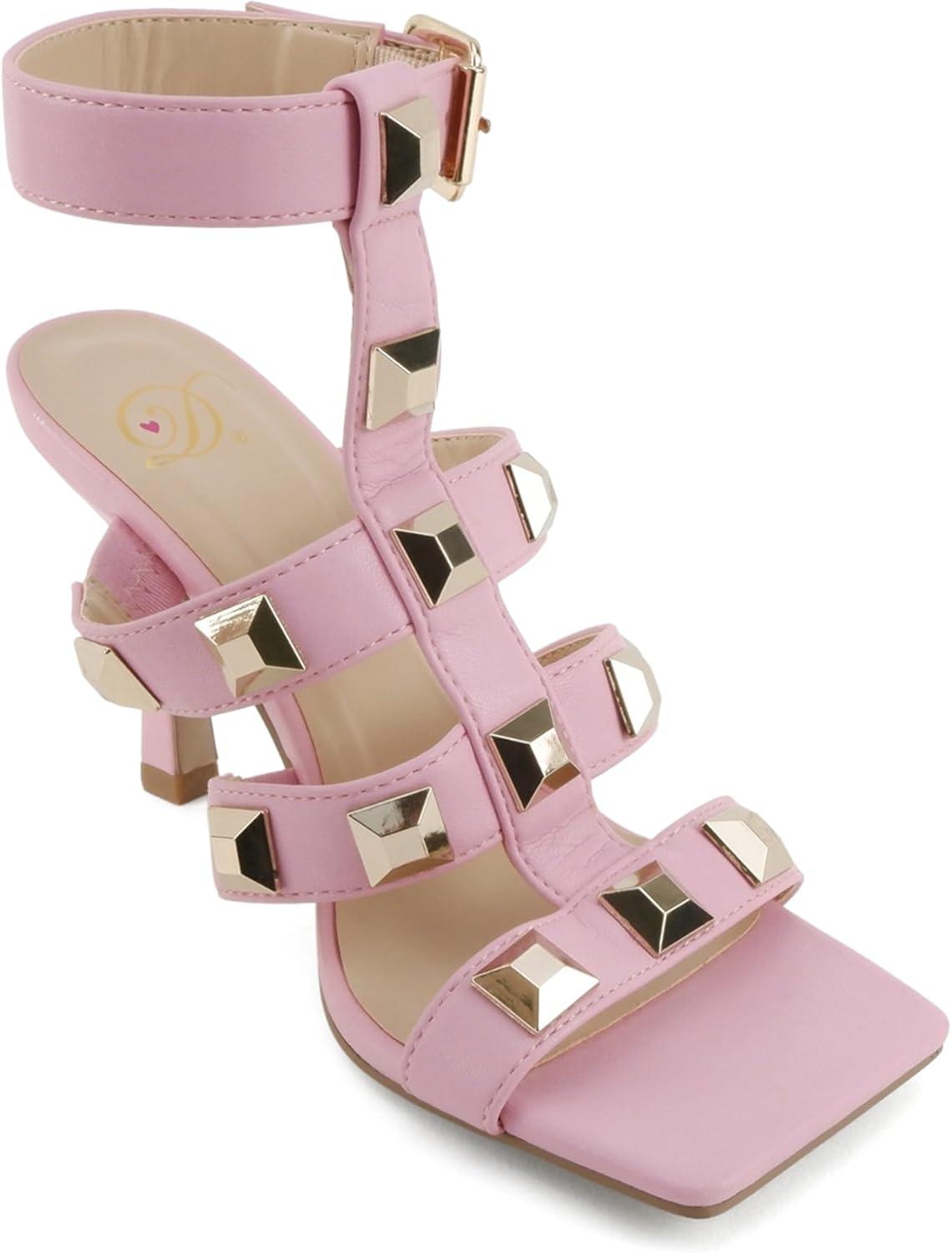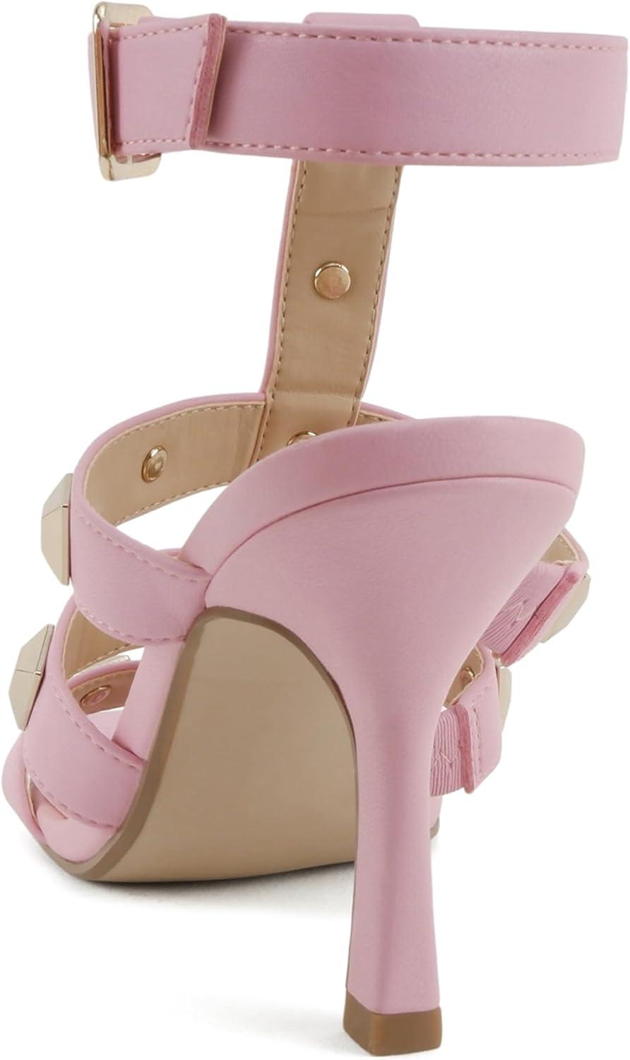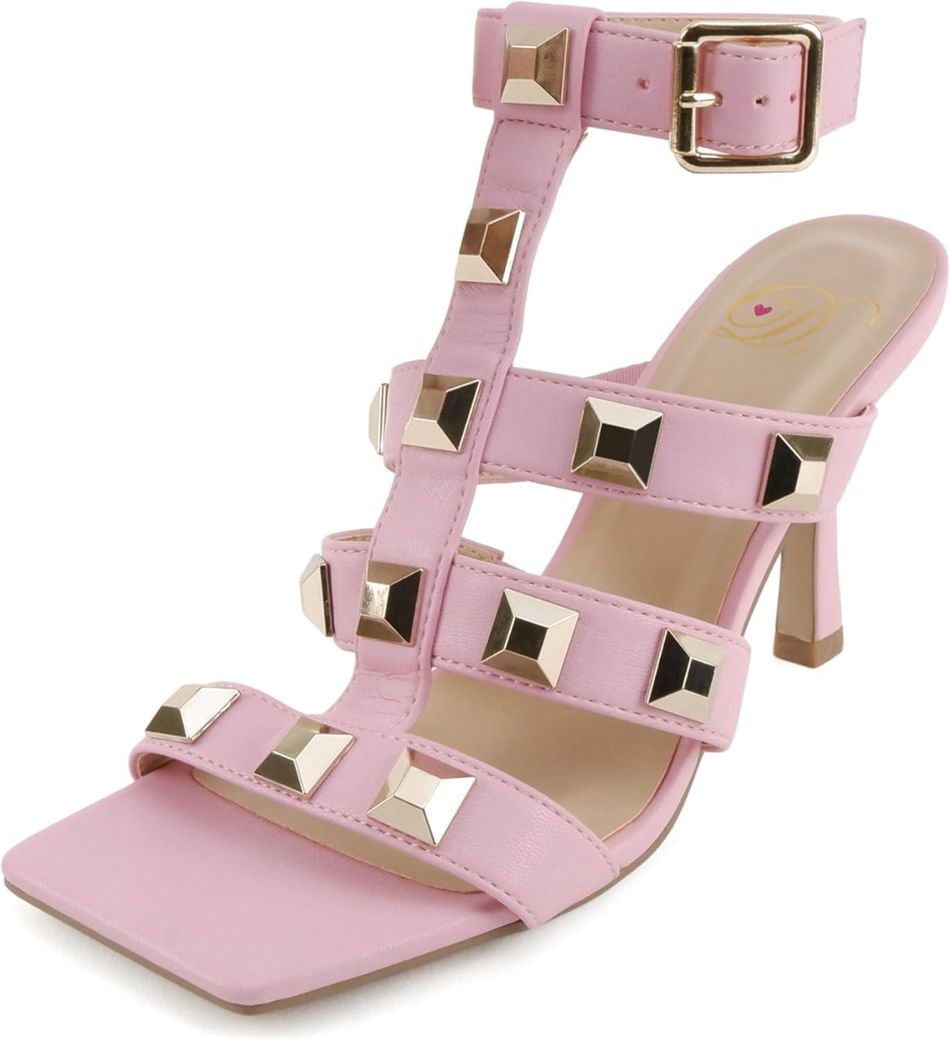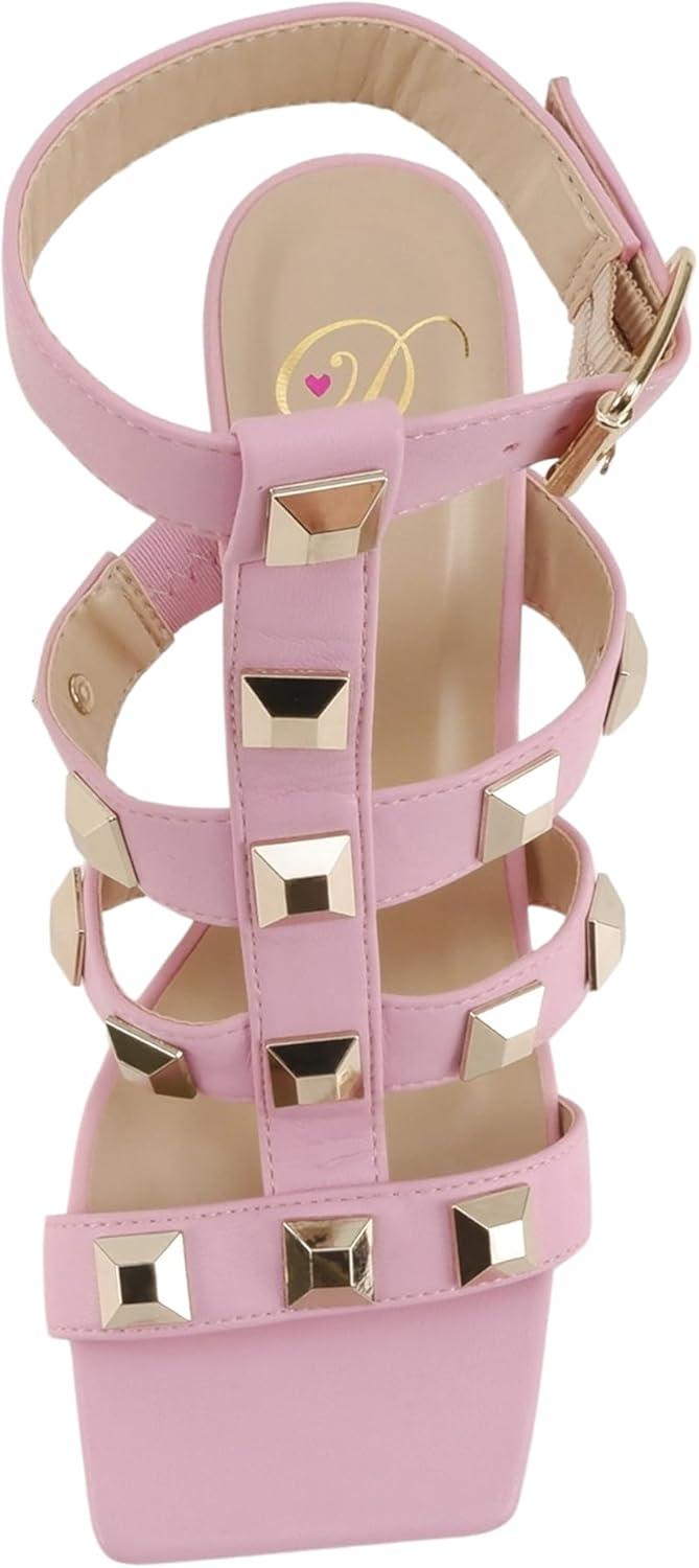 Soda “Upton” ~ Women Square Toe Studded Multi-Strap High Heeled Fisherman Sandals(Pink Pu)